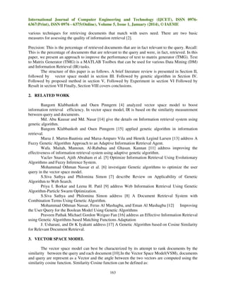 This document summarizes an article that proposes using genetic algorithms to improve the effectiveness of a text to matrix generator. It begins with an overview of information retrieval and discusses the vector space model and genetic algorithms. It then proposes a genetic approach to optimize the objective function of a text to matrix generator to increase the average number of terms. The goal is to retrieve more relevant documents by obtaining the best combination of terms from document collections using genetic algorithms. Experimental results are presented to validate that the genetic approach improves the performance of the text to matrix generator.