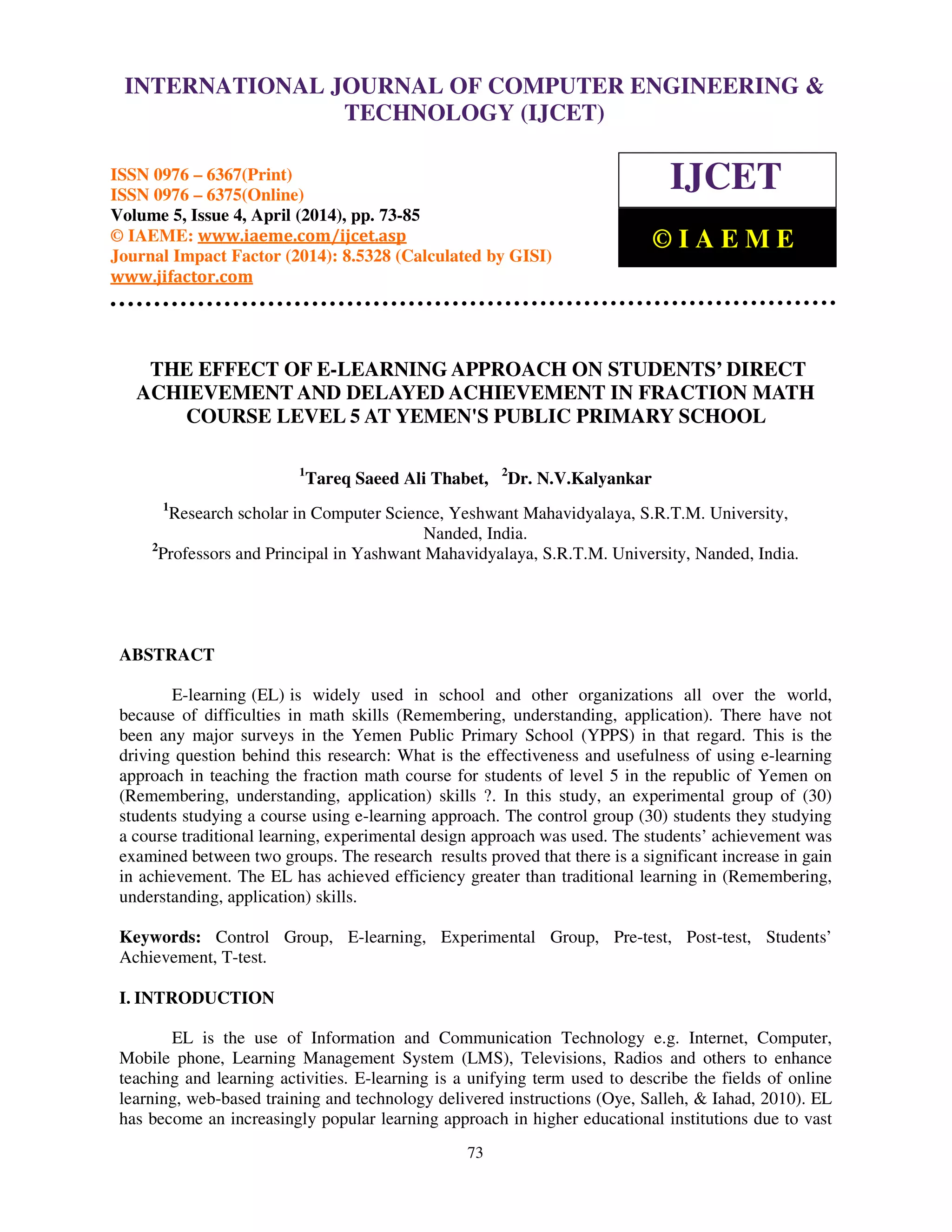 This document discusses a study that examined the effectiveness of e-learning compared to traditional learning for teaching fractions to 5th grade students in Yemeni public primary schools. An experimental group of 30 students learned fractions using an e-learning approach while a control group of 30 students learned fractions through traditional methods. Results showed that the e-learning approach led to significantly higher achievement and gains in remembering, understanding, and applying fraction concepts compared to the traditional approach. The document provides background on e-learning and reasons for its increased use, including reducing geographical and financial barriers to education.