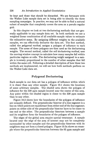 This document discusses two methods for declustering sample data to obtain a better estimate of the global mean: polygonal declustering and cell declustering.