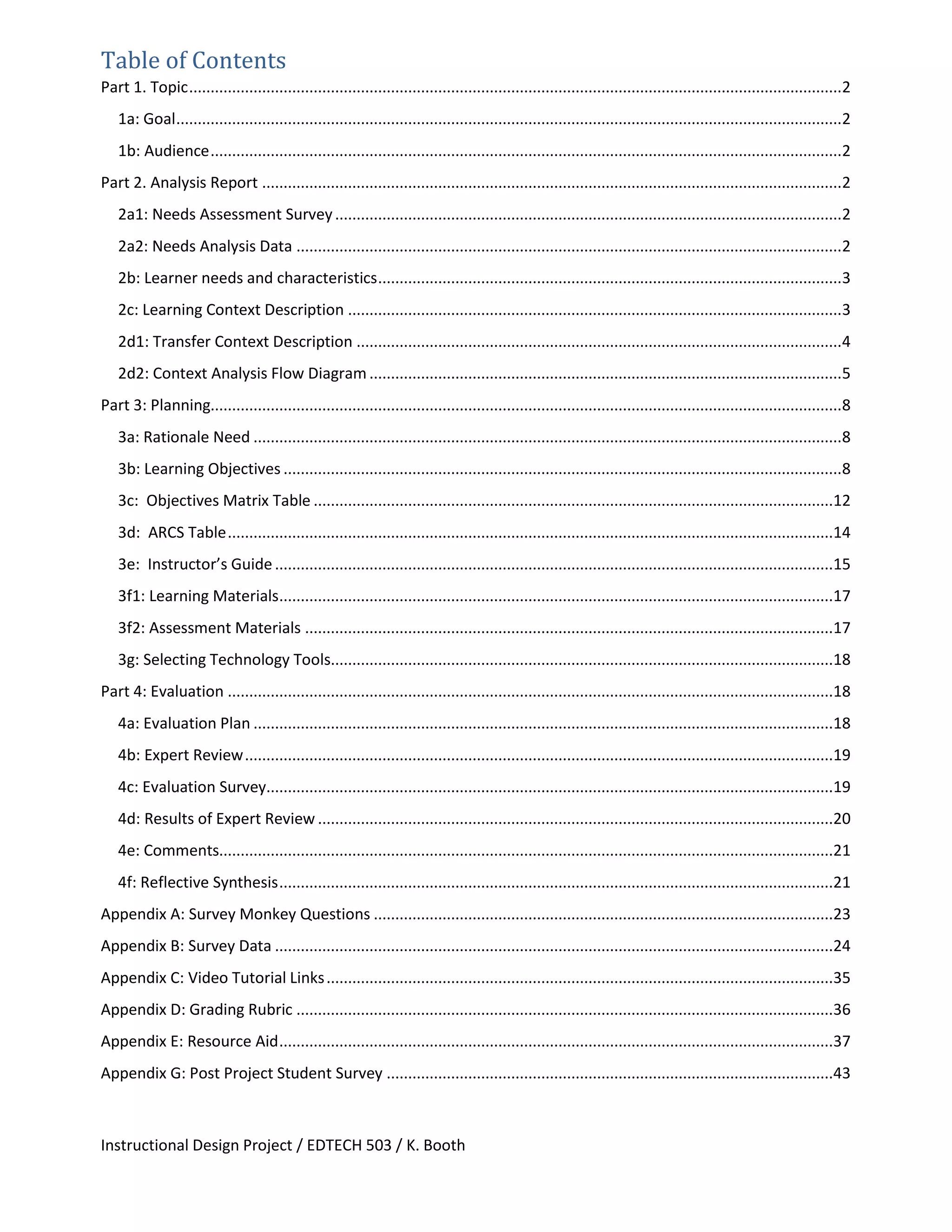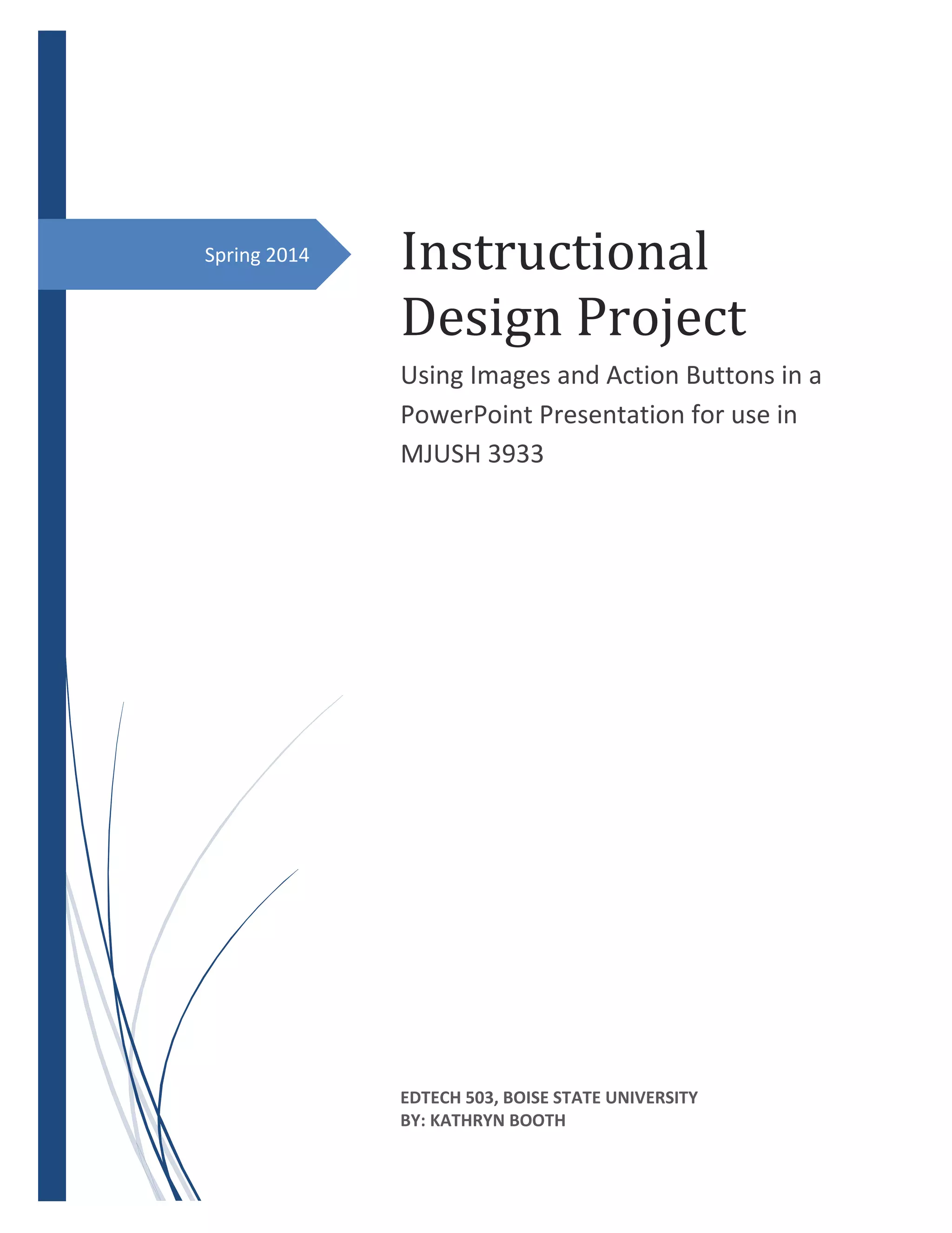 This instructional design project provides a plan for teaching eighth grade students how to create a 5-slide PowerPoint presentation with text, images, and action buttons. The plan includes analyzing learner needs through a survey, establishing learning objectives, and designing instructional materials and assessments. Objectives cover topics like inserting text and images, formatting text, and adding hyperlinks between slides. Students will view an instructional video, create a sample presentation, self-assess their work against a rubric, and submit their completed presentation for grading. The goal is to provide students with 21st century presentation skills that transfer to assessments in their online history course and beyond.