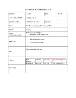 1. Dokumen tersebut berisi rancangan pengajaran harian untuk beberapa mata pelajaran dan kelas yang mencakupi tujuan pembelajaran, aktiviti, dan bahan bantu mengajar.