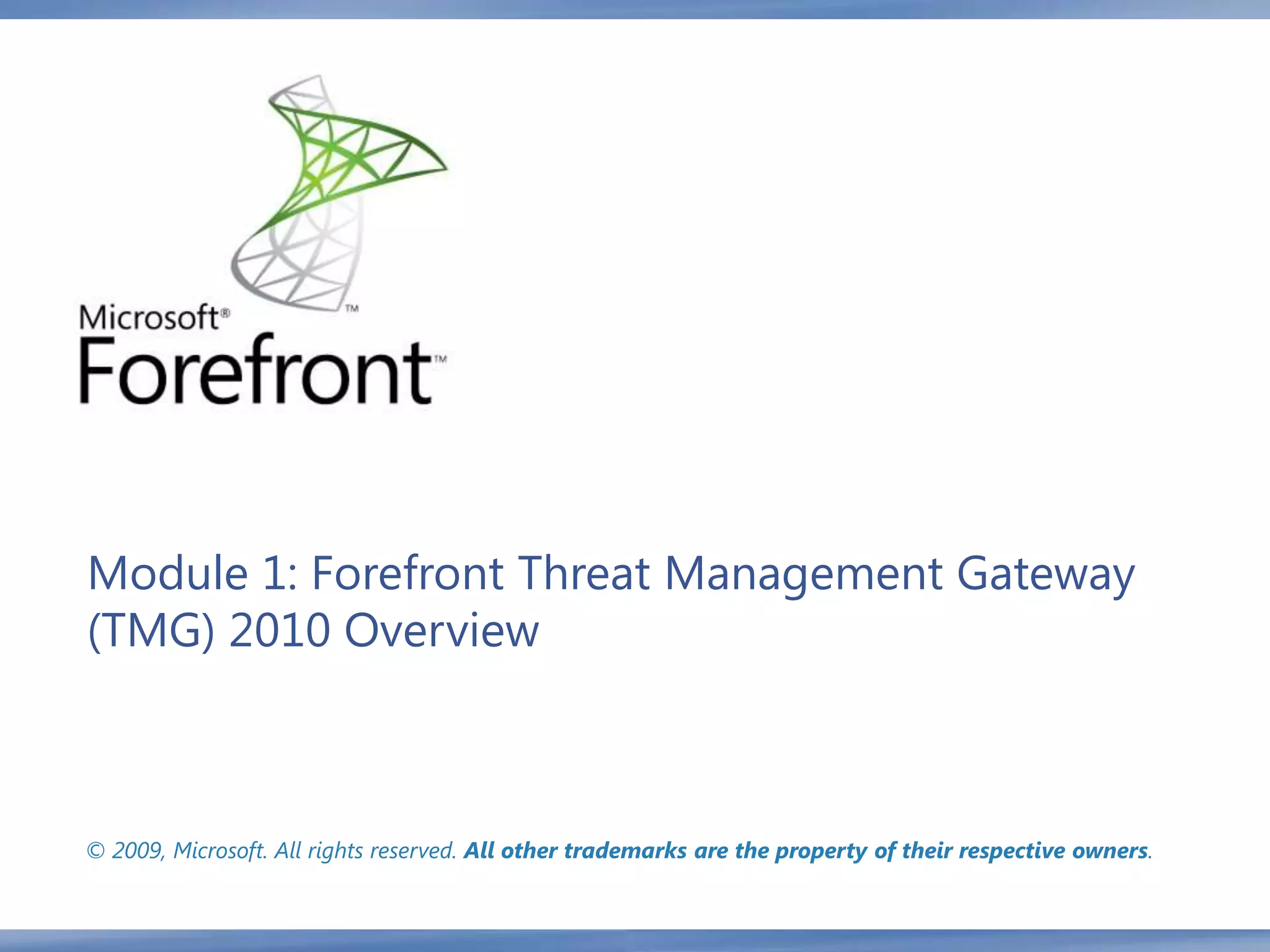 Forefront TMG 2010 provides integrated network edge protection and application-centric access control. It offers firewall, secure web gateway, secure email relay, and remote access gateway capabilities in a single platform. The document discusses TMG's deployment scenarios, features, licensing options, and system requirements for installation. It also provides an overview of the installation process and initial configuration steps for network and system settings.