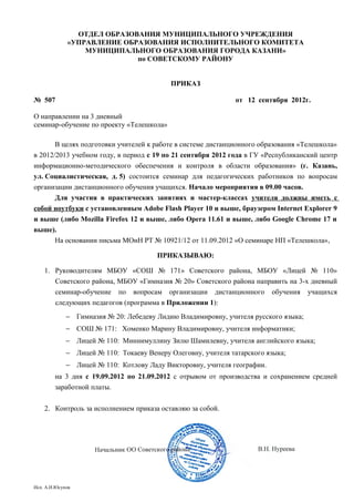 Приказ отдела образования о направлении учителей на семинар по дистанционному обучению 'Телешкола' в Казани с 19 по 21 сентября 2012 года. Участвующие педагоги должны иметь ноутбуки с соответствующими программами. Семинар включает лекции и практические занятия по организации дистанционного обучения.