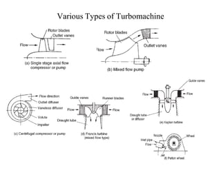 A turbomachine is defined as a device that transfers energy to or from a continuously flowing fluid using one or more moving blade rows. Turbomachines are classified into two main categories - those that absorb power to increase fluid pressure like compressors and pumps, and those that produce power by expanding fluid to a lower pressure like turbines. They are further categorized based on the flow path, which can be axial, radial, or mixed, and by the compressibility and pressure changes in the fluid flow through the rotor.