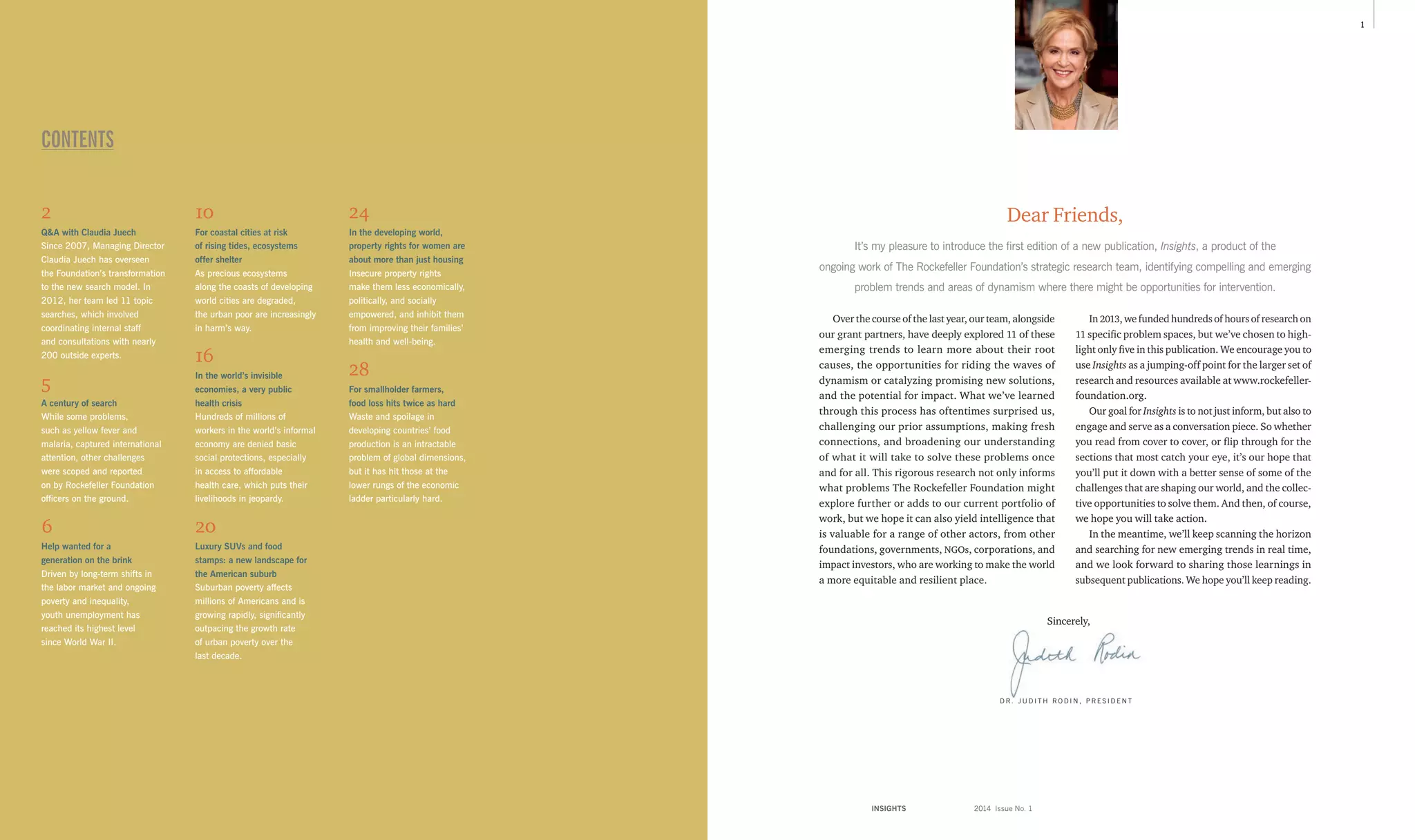 The 2014 issue of 'Insights' from the Rockefeller Foundation explores emerging trends and pressing problems, highlighting five specific areas of concern based on thorough research involving external experts. The publication aims to inform and engage diverse stakeholders in addressing challenges such as youth unemployment, coastal city vulnerabilities, and women's property rights. Ultimately, the foundation seeks to catalyze innovative solutions and collective action to create a more equitable and resilient world.