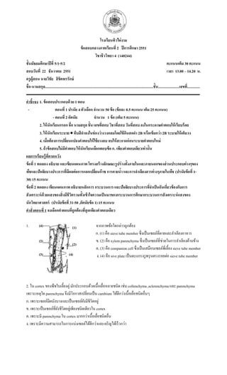2 ปีการศึกษา 2551 วิชาชีววิทยา 4 (ว40244) ชั้นมัธยมศึกษาปีที่ 5/1-5/2 คะแนนเต็ม 30 คะแนน สอบวันที่ 22 ธันวาคม 2551 เวลา 13.00 – 14.20 น. ครูผู้สอน นายวิชัย ลิขิตพรรักษ์ ชื่อ-นามสกุล......................................................................................................................ชั้น.......................เลขที่.............. คาชี้แจง 1. ข้อสอบประกอบด้วย 1 ตอน - ตอนที่ 1 ปรนัย 4 ตัวเลือก จานวน 50 ข้อ (ข้อละ 0.5 คะแนน เต็ม 25 คะแนน) - ตอนที่2 อัตนัย จานวน 1 ข้อ (เต็ม 5 คะแนน) 2. ให้นักเรียนกรอก ชื่อ นามสกุล ชั้น เลขที่สอบ วิชาที่สอบ วันที่สอบ ลงในกระดาษคาตอบให้เรียบร้อย 3. ให้นักเรียนระบาย ทึบสีดาลงในช่องว่างวงกลมโดยใช้ดินสอดา 2B หรือเข้มกว่า 2B ระบายให้เต็มวง 4. เมื่อต้องการเปลี่ยนแปลงคาตอบให้ใช้ยางลบ ลบให้สะอาดก่อนระบายคาตอบใหม่ 5. ถ้าข้อสอบไม่มีคาตอบ ให้นักเรียนเลือกตอบข้อ ก. เพียงคาตอบเดียวเท่านั้น ผลการเรียนรู้ที่คาดหวัง ข้อที่ 1 ทดลอง อธิบาย และเขียนแผนภาพ โครงสร้างลักษณะรูปร่างทั้งภายในและภายนอกของส่วนประกอบต่างๆของ พืชและปัจจัยบางประการที่มีผลต่อการแลกเปลี่ยนก๊าซ การคายน้า และการลาเลียงสารต่างๆภายในพืช (ปรนัยข้อที่ 1- 30) 15 คะแนน ข้อที่ 2 ทดลอง เขียนแผนภาพ อธิบายหลักการ กระบวนการ และปัจจัยบางประการที่จาเป็นอันเกี่ยวข้องกับการ สังเคราะห์ด้วยแสงของสิ่งมีชีวิตรวมทั้งเข้าใจความเป็นมาของกระบวนการศึกษากระบวนการสังเคราะห์แสงของ นักวิทยาศาสตร์ (ปรนัยข้อที่ 31-50 ,อัตนัยข้อ 1) 15 คะแนน คาสั่งตอนที่ 1 จงเลือกคาตอบที่ถูกต้องที่สุดเพียงคาตอบเดียว 1. -hจากภาพข้อใดกล่าวถูกต้อง ก. (1) คือ sieve tube member ซึ่งเป็นเซลล์ที่ตายและลาเลียงอาหาร ข. (2) คือ xylem parenchyma ซึ่งเป็นเซลล์ที่ช่วยในการลาเลียงด้านข้าง ค. (3) คือ companion cell ซึ่งเป็นเสมือนเซลล์พี่เลี้ยง sieve tube member ง. (4) คือ sive plate เป็นตะแกรงรูพรุนตรงรอยต่อ sieve tube member 2. ใน cortex ของพืชใบเลี้ยงคู่ มักประกอบด้วยเนื้อเยื่อหลายชนิด เช่น collenchyma ,sclerenchyma และ parenchyma เพราะเหตุใด parenchyma จึงมีโอกาสเปลี่ยนเป็น cambium ได้ดีกว่าเนื้อเยื่อชนิดอื่นๆ ก. เพราะเซลล์มีผนังบางและเป็นเซลล์ยังมีชีวิตอยู่ ข. เพราะเป็นเซลล์ที่ยังชีวิตอยู่เพียงชนิดเดียวใน cortex ค. เพราะมี parenchyma ใน cortex มากกว่าเนื้อเยื่อชนิดอื่น ง. เพราะมีความสามารถในการแบ่งเซลล์ได้ดีกว่าและเจริญได้เร็วกว่า (1) (2) (3) (2) (4) (4)