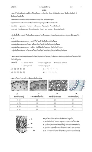 พืชสีเขียวชั้นสูงที่เจริญบนบก แสดงการปรับตัวเองให้เหมาะสมเป็นพิเศษกับหน้าที่ของมันในแง่จุดเริ่มต้นของห่วง โซ่และสายใยอาหารของระบบนิเวศที่มันเจริญอยู่คือข้อใด ก. มีลักษณะใบแบนบางสีเขียวคอยรับแสง ข. มีผลและเมล็ดที่สะสมอาหารปริมาณมาก ค. มีระบบรากที่สามารถแผ่ขยายไปได้ไกล ง. มีลาต้นที่แข็งแรงและอายุยืนหลายสิบปี 9. จากรูปโครงสร้างภายในของรากพืช ข้อใดถูกต้อง ก. (1) = zone of cell generation ข. (2) = zone of cell division ค. (3) = zone of root cap ง. (4) = zone of cell elongation 10. การใช้กล้องจุลทรรศน์ตรวจดูโครงสร้างภายในของพืชจาก 3 สไลด์พบลักษณะเด่นดังนี้ สไลด์(1) ผิวนอกสุดเป็นคอร์ก ใจกลางมีพิธน้อยมาก เนื้อเยื่อส่วนใหญ่เป็นไซเลมระยะที่ 2 และมีวาสคิวลาร์แคมเบียม สไลด์(2) ชั้นคอร์กกว้างมาก ในชั้นสตีลพบกลุ่มเซลล์ไซเลนเรียงตัวเป็น 4 แฉก มีโฟลเอ็มอยู่ระหว่างแฉกของไซเลม สไลด์(3) วาสคิวลาร์บันเดิลกระจายอยู่ทั่วไป กลุ่มที่อยู่ใกล้ชั้นผิวมีขนาดเล็กกว่าและมีจานวนมากกว่าชั้นถัดเข้าไป สไลด์(1) (2) และ (3) ควรเป็นโครงสร้างของอะไรตามลาดับ ก. ลาต้นไผ่ รากข้าวโพด และลาต้นชบา ข. ลาต้นจาปี รากปาล์ม และลาต้นหญ้าขน ค. รากปาล์ม ลาต้นผักบุ้ง และรากข้าวโพด ง. ลาต้นส้ม รากผักบุ้ง และลาต้นข้าวโพด 11. ข้อใดถูกต้องเกี่ยวกับโครงสร้างของพืชดอก (1) ที่บริเวณก้านใบของพืชดอกจะประกอบขึ้นจากเซลล์ทั้งที่มีชีวิตและไม่มีชีวิต (2) pith สามารถพบได้ทั้งในราก ลาต้น และใบของพืชใบเลี้ยงคู่ที่อยู่ในการเจริญเติบโตขั้นแรก (3) เซลล์ขนรากและเซลล์คุมเป็นเซลล์ที่พบในเนื้อเยื่อชนิดเดียวกัน แต่ที่เซลล์ขนรากไม่มีคลอโรพสาต์ (4) ใบของพืชดอกที่อาศัยในน้าจะต้องมีเซลล์คุม จึงจะเกิดกระบวนการสังเคราะห์ด้วยแสงและการลาเลียงน้าได้ ก. (1) (3) ข. (2) (3) (4) ค. (2) (4) ง. (1) (2) (3) (4) 12. casparian strip แตกต่างจาก passage cell อย่างไรบ้าง (1) ชั้นเนื้อเยื่อที่พบ (2) บริเวณที่พบในพืช (3) การยอมในน้าผ่าน (4) การยอมให้เกลือแร่ผ่าน (5) เส้นทางลาเลียงสาร (6) ชนิดของสารที่สะสม ก. (1) (2) ข. (2) (6) ค. (2) (5) (6) ง. (3) (4) (6) 13. จากภาพข้อใดกล่าวได้ถูกต้อง ก. สามารถพบลักษณะนี้ได้ทั้งในรากและลาต้นของพืชใบเลี้ยงคู่ ข. (3) เป็นส่วนประกอบของเนื้อเยื่อ epidermisและ cortex ค. (1) และ (2) ต่างก็เป็นเนื้อเยื่อลาเลียงอาหารและแร่ธาตุ ง. (1) เป็นส่วนที่เรียกว่า แก่น ส่วน (2) เรียกว่า กระพี้ 14. วงปีของต้นไม้จะมีสีเข้มและอ่อนต่างกันอย่างชัดเจน ถ้าขึ้นอยู่ในพื้นที่แบบใด (1) มีอุณหภูมิต่างกันระหว่างฤดูร้อนกับฤดูหนาว (2) ได้รับแสงต่างกันมากระหว่างฤดูฝนและฤดูแล้ง (3) ได้รับธาตุอาหารต่างกันมากระหว่างฤดูฝนกับฤดูหนาว (4) ได้รับน้าฝนต่างกันมากระหว่างฤดูฝนและฤดูแล้ง (1) (4) (3) (2) (1) (2) (3) 
