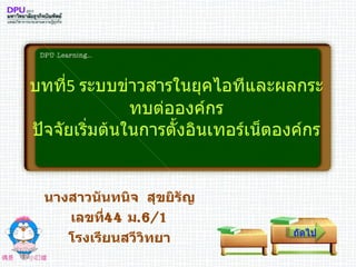 บทที่51 1. บทที่ 5 ระบบข่าวสารในยุคไอทีและผลกระทบต่อองค์กร ปัจจัยเริ่มต้นในการตั้งอินเทอร์เน็ตองค์กร นางสาวนันทนิจ สุขยิรัญ เลขที่ 44 ม .6/1 โรงเรียนสวีวิทยา ถัดไป 2. 3. ทะเบียนชื่อโดเมนมีไว้เพื่อใช้อ้างอิงถึงกันในระบบเครือข่าย เช่น ใช้เป็นชื่อองค์กร tv5 . co . th โดยจากขวามือสุด " th " คือ " ชื่อประเทศ " ถัดไป " co " คือ " ประเภทขององค์กร " และ " tv5 " คือ " ชื่อองค์กร " เมื่อมี " วงจรเช่าสายสื่อสาร " " หมายเลขแอดเดรส " ( IP Address ) และ " ชื่อโดเมน ( Domain Name )" แล้ว ก็สามารถสร้างโหนด ( Node ) หรือเครือข่ายในองค์กรได้ เช่น โรงเรียนแห่งหนึ่งต้องการเชื่อมต่อเข้าสู่เครือข่าย Schoolnet ซึ่งเป็นส่วนหนึ่งของอินเทอร์เน็ต ก็ต้องดำเนินการให้ได้หมายเลข IP และชื่อโดเมนก่อน การจดทะเบียนชื่อโดเมน ( Domain Name ) ถัดไป ย้อนกลับ 4. หลักการจดชื่อโดเมน ชื่อโดเมนต้องมีความยาว ไม่น้อยกว่า 2 ตัวอักษร และไม่มากกว่า 64 ตัวอักษร เมื่อไม่รวมนามสกุล สามารถใช้ตัวอักษรภาษาอังกฤษ ตัวเลข และเครื่องหมาย - ( ขีดกลาง ) ได้เท่านั้น ต้องขึ้นต้นและลงท้ายด้วย ตัวอักษรภาษาอังกฤษ หรือ ตัวเลขเท่านั้น ตัวอักษรเล็กหรือใหญ่ มีค่าเท่ากัน ( A = a ) ตัวอย่างชื่อโดเมนที่ถูกต้อง คือ a - b - c - d . net, abc123 . com ตัวอย่างชื่อโดเมนที่ไม่ถูกต้อง คือ - a - b . com, a -- b . org, ab -. com ย้อนกลับ ถัดไป 5. ราคาของชื่อโดเมนแต่ละนามสกุล ( สำหรับการจดชื่อโดเมน 1 ชื่อ เป็นเวลา 1 ปี ) . com / . net / . org / . biz / . info = 450 บาท . ws = 450 บาท ( ชื่อโดเมนต้องมีความยาวอย่างน้อย 4 ตัวอักษร ) . th = 1,000 บาท ( จำเป็นต้องใช้เอกสารในการจดทะเบียน ) . name = 500 บาท . cc = 1,200 บาท . tv = 1,300 บาท . in = 750 บาท . cn / . com . cn / . net . cn / . org . cn = 700 บาท . tw = 1,400 บาท . mobi = 900 บาท ถัดไป ย้อนกลับ 6. สิทธิพิเศษ ใช้งานได้ฟรีทันที เมื่อจดโดเมน ( สำหรับผู้ที่ไม่ต้องการใช้บริการเว็บโฮสติ้ง ) ระบบจัดการ DNS Zone สามารถแก้ไข A / MX / NS / CNAME Record ได้ URL Forwarding ( Redirect ) , E - Mail Forwarding โดเมนที่จดกับทางเรา สามารถนำไปลงทะเบียนเป็น DNS ได้ทันที ( เช่น nsXX . yourdomain . com ) ถัดไป ย้อนกลับ 7. ความปลอดภัย และ ความเป็นส่วนตัว การติดต่อกับทางเราในกรณีที่เกี่ยวข้องกับชื่อโดเมน จะต้องติดต่อโดยใช้อีเมลของ Administrator ของโดเมนเท่านั้น โดเมนที่จดทะเบียนใหม่ หรือย้ายมาที่เรา ทางเราจะทำการ Lock โดเมนของท่านไว้เพื่อความปลอดภัย ซึ่งจะมีผลทำให้ 1 .) ไม่สามารถแก้ไขข้อมูล DNS ได้ ( ยกเว้นลูกค้าที่จดชื่อโดเมนหลังวันที่ 15/12/2549 สามารถ Login เพื่อแก้ไข DNS ได้ทันทีโดยไม่ต้องแจ้งให้ทางเรา Unlock ) 2 .) ไม่สามารถแก้ไขชื่อ Registrant ได้ 3 .) ไม่สามารถย้าย Registrar ได้ 4 .) ไม่สามารถนำชื่อโดเมนไปจดทะเบียนใหม่ได้ จนกว่าชื่อโดเมนจะหมดอายุและเลยระยะเวลาสำหรับ renew ไปแล้ว ถัดไป ย้อนกลับ 8. ทั้งนี้ หากท่านต้องการให้ทางเรา Unlock ชื่อโดเมน สา