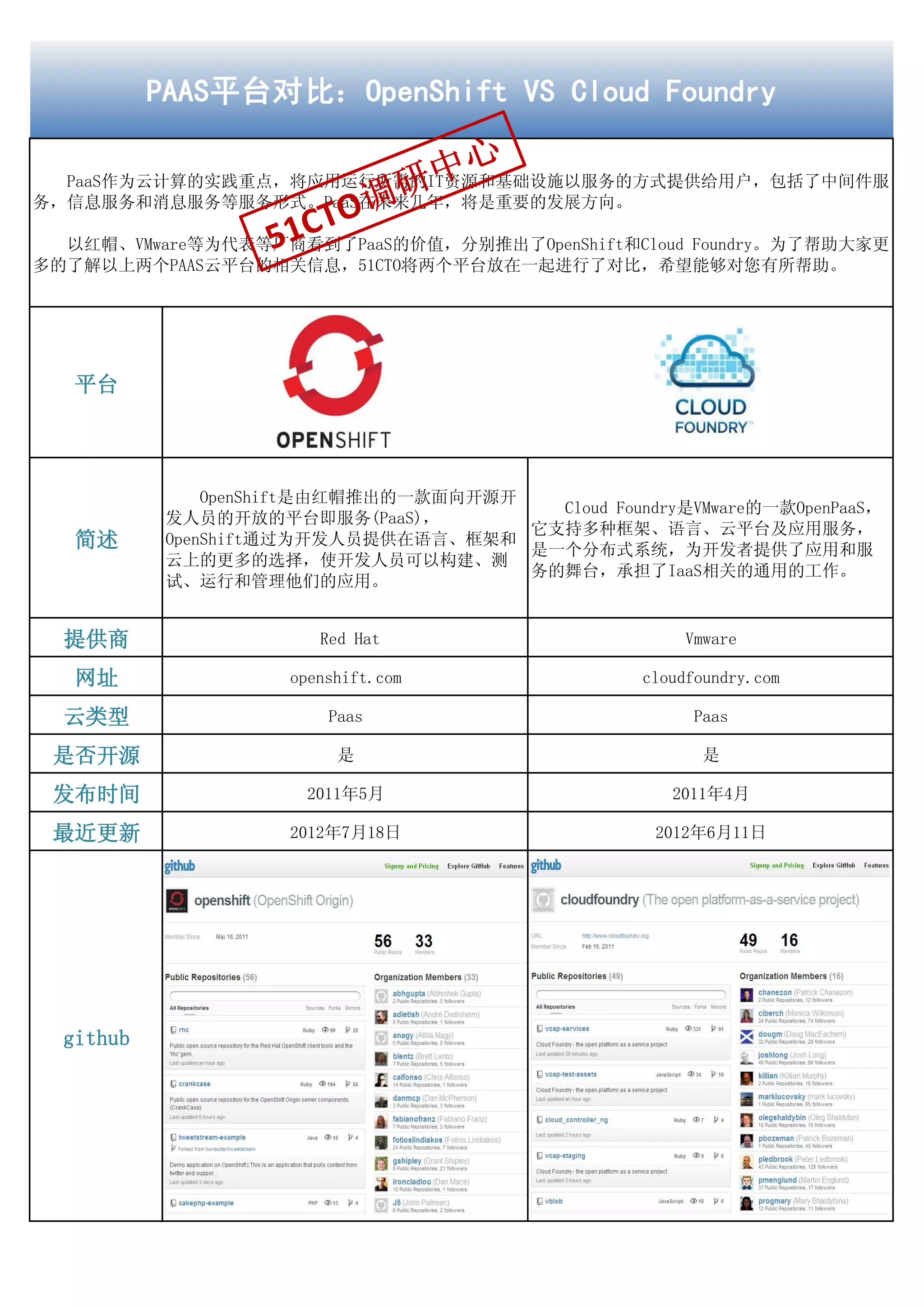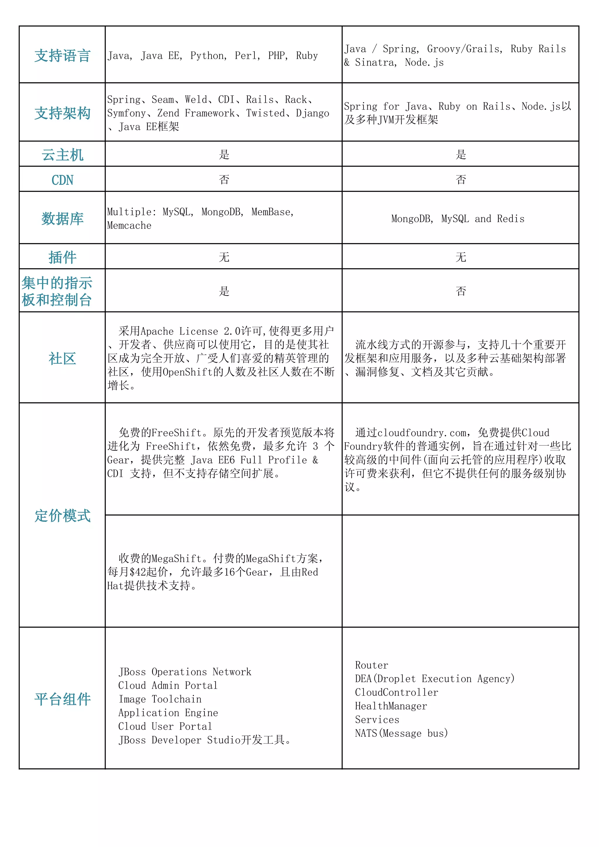 本文对两种平台即服务(PaaS)进行了比较:红帽的OpenShift和VMware的Cloud Foundry。两者均为开源平台,支持多种编程语言和框架,但各自的特点与扩展能力有所不同。OpenShift提供自愈和可扩展的系统设计,而Cloud Foundry则关注企业级Java的支持及用户友好的界面。