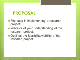 This document provides guidance for writing project proposals, reports, and research papers. It discusses the typical components of a research proposal, including the title, background study, problem statement, objectives, literature review, and methodology. It also provides tips for writing the different sections of a research report or paper, such as the introduction, methods, results, discussion, and conclusions. Additionally, it covers topics like properly citing references, presenting data, generating knowledge and understanding from information, and writing abstracts.