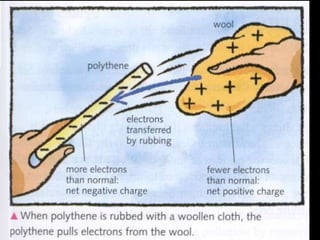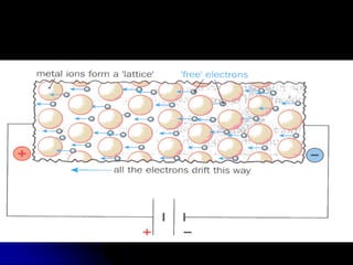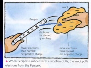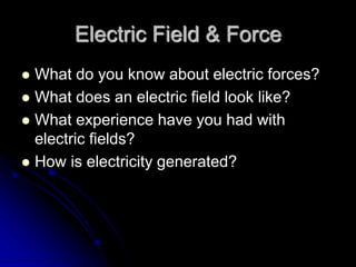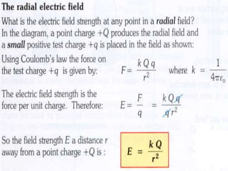 Electric fields arise from electric charges and can be represented by electric field lines. A positive test charge experiences a force when placed in an electric field, allowing the field strength to be calculated. The field is strongest closest to the charged object and decreases with distance. Materials are classified as conductors, insulators or semiconductors based on how easily their electrons can move. Coulomb's law defines the force between two point charges as directly proportional to the product of the charges and inversely proportional to the square of the distance between them.