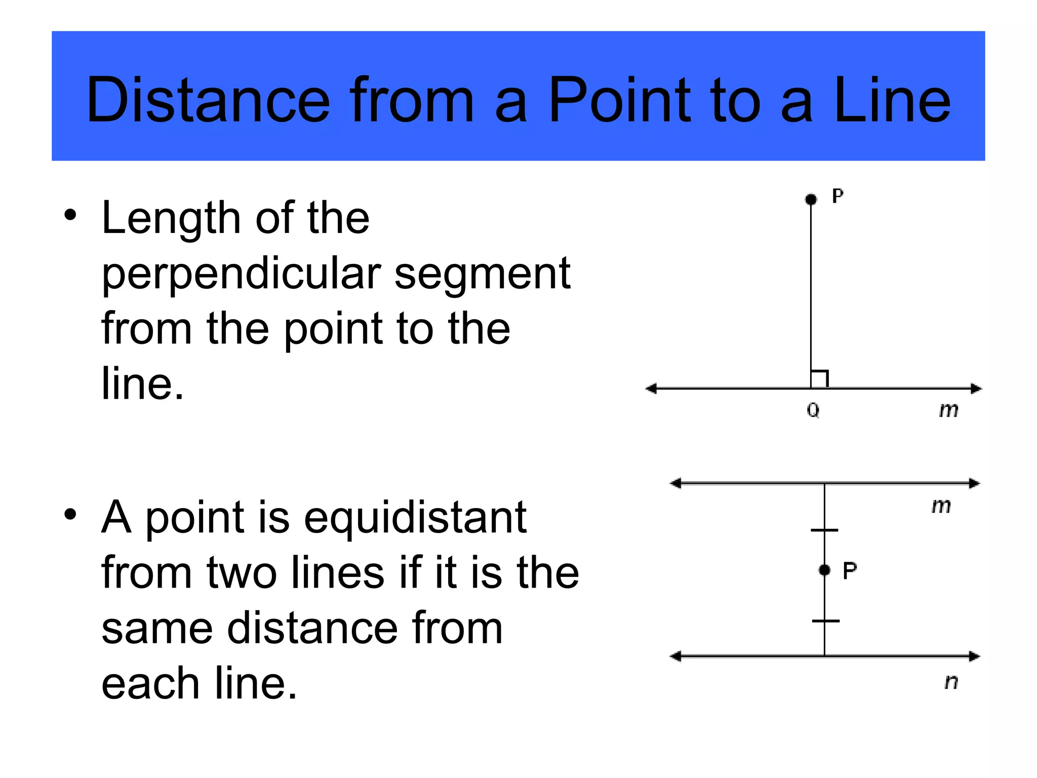 This document discusses properties of perpendiculars, bisectors, and equidistance as they relate to points, lines, and angles. It states that the distance from a point to a line is the length of the perpendicular segment, and a point is equidistant from two lines if it is the same distance from each. It also presents theorems that if a point is on the bisector of an angle, it is equidistant from the two sides, and if a point within an angle is equidistant from the sides, it lies on the bisector.