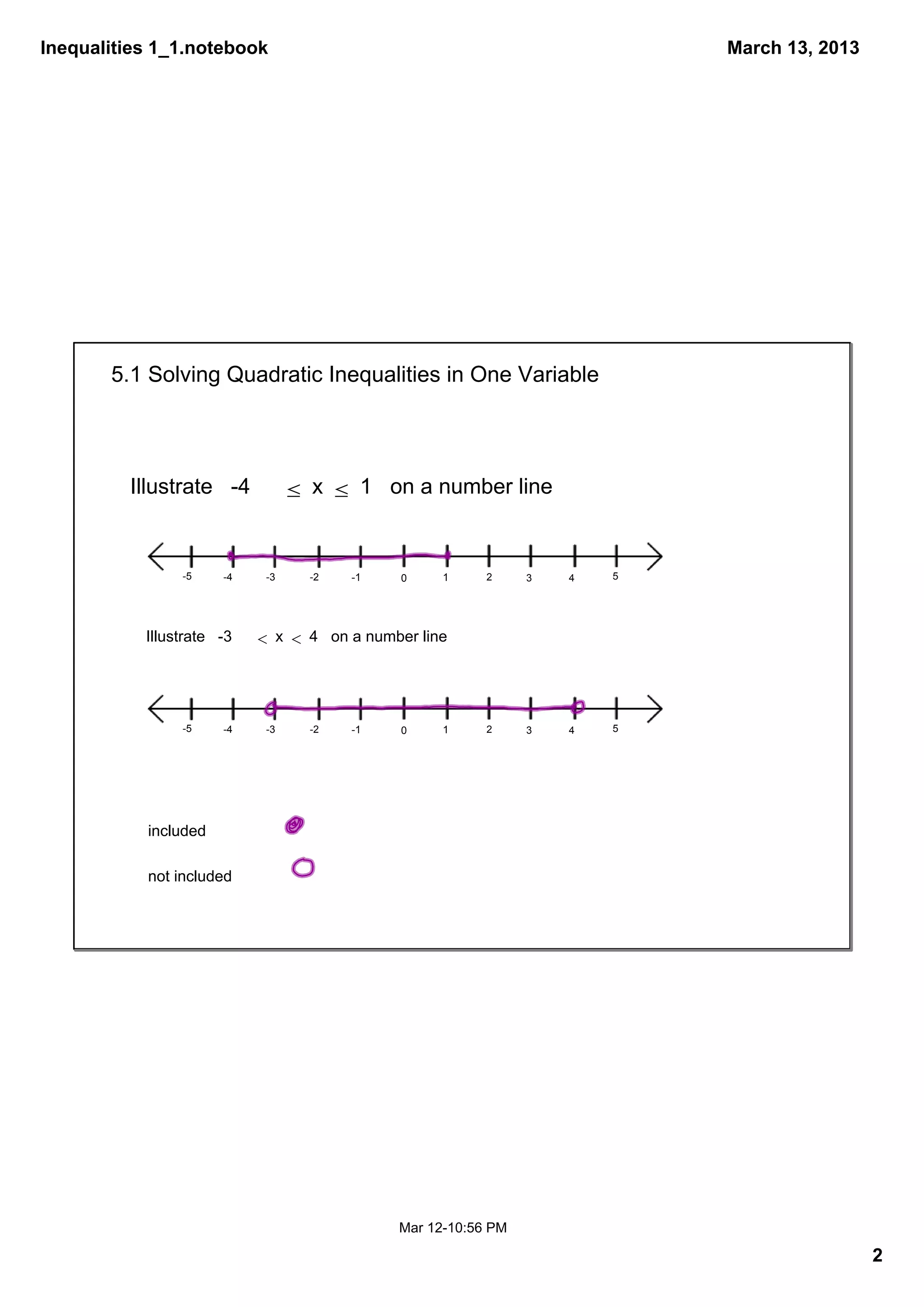 This document contains notes from a math class covering chapter 5 on graphing inequalities and systems of equations. It outlines the schedule for the chapter with topics being covered on Tuesdays and Thursdays. Examples are provided for solving quadratic inequalities in one variable by representing the solutions on number lines using critical values. The homework assignment lists specific problems from page 345 to complete.