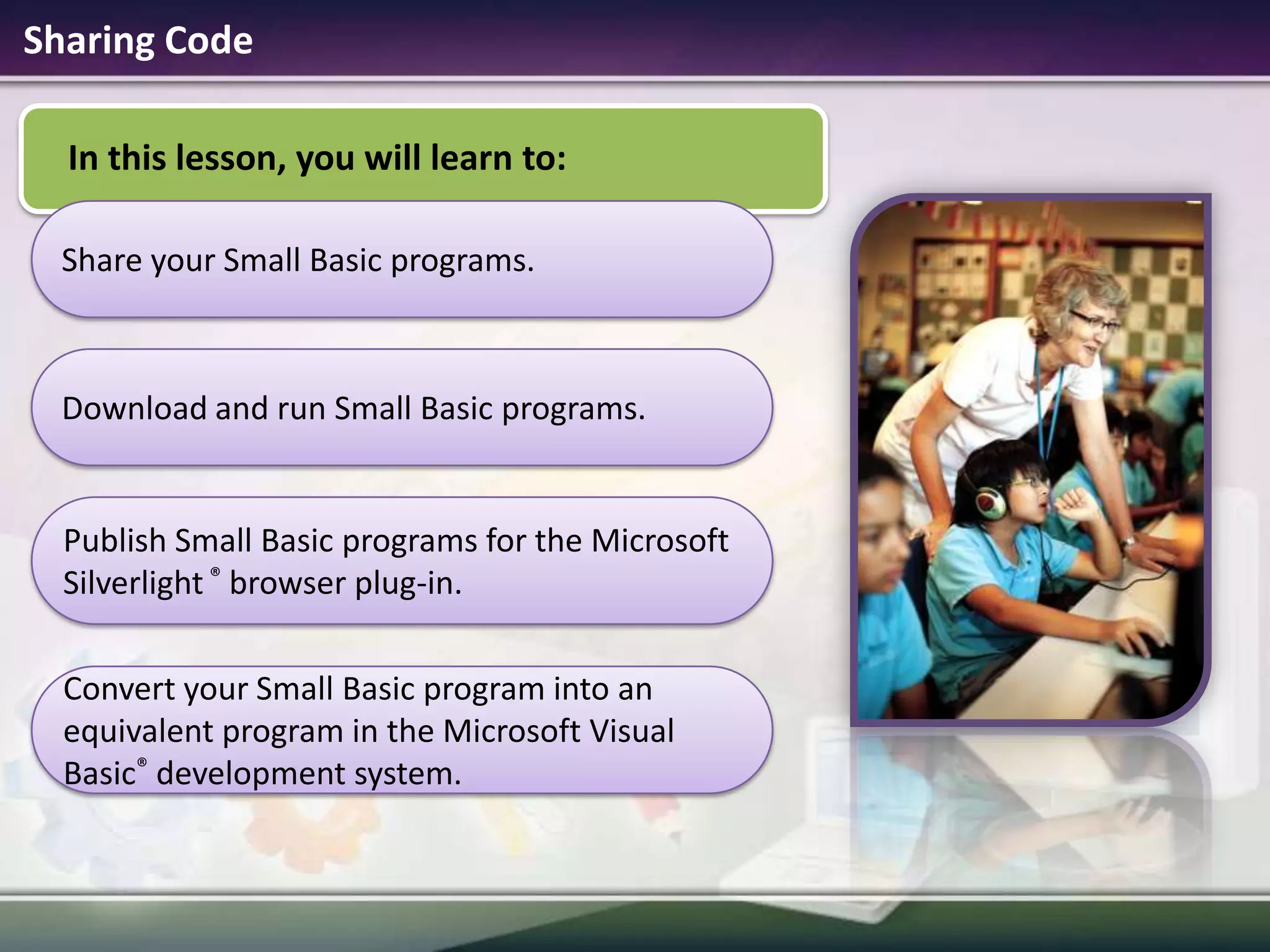 This document discusses how to share Small Basic programs by publishing them online through the Publish button. Others can access published programs using a unique ID and view them online or import them into Small Basic. Programs can also be converted to Visual Basic format using the Graduate button.