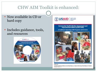 The document discusses the CHW AIM Toolkit, which provides guidance, tools and resources to strengthen community health worker programs. It has been field tested in several countries. The toolkit includes matrices and tools to assess 12 components of CHW program functionality. Results from 19 programs showed average scores below 3, indicating most programs need strengthening. An operations research study is underway to test if applying the toolkit improves CHW performance. A Community of Practice website (CHWCentral.org) was also launched to facilitate information sharing between CHW programs.