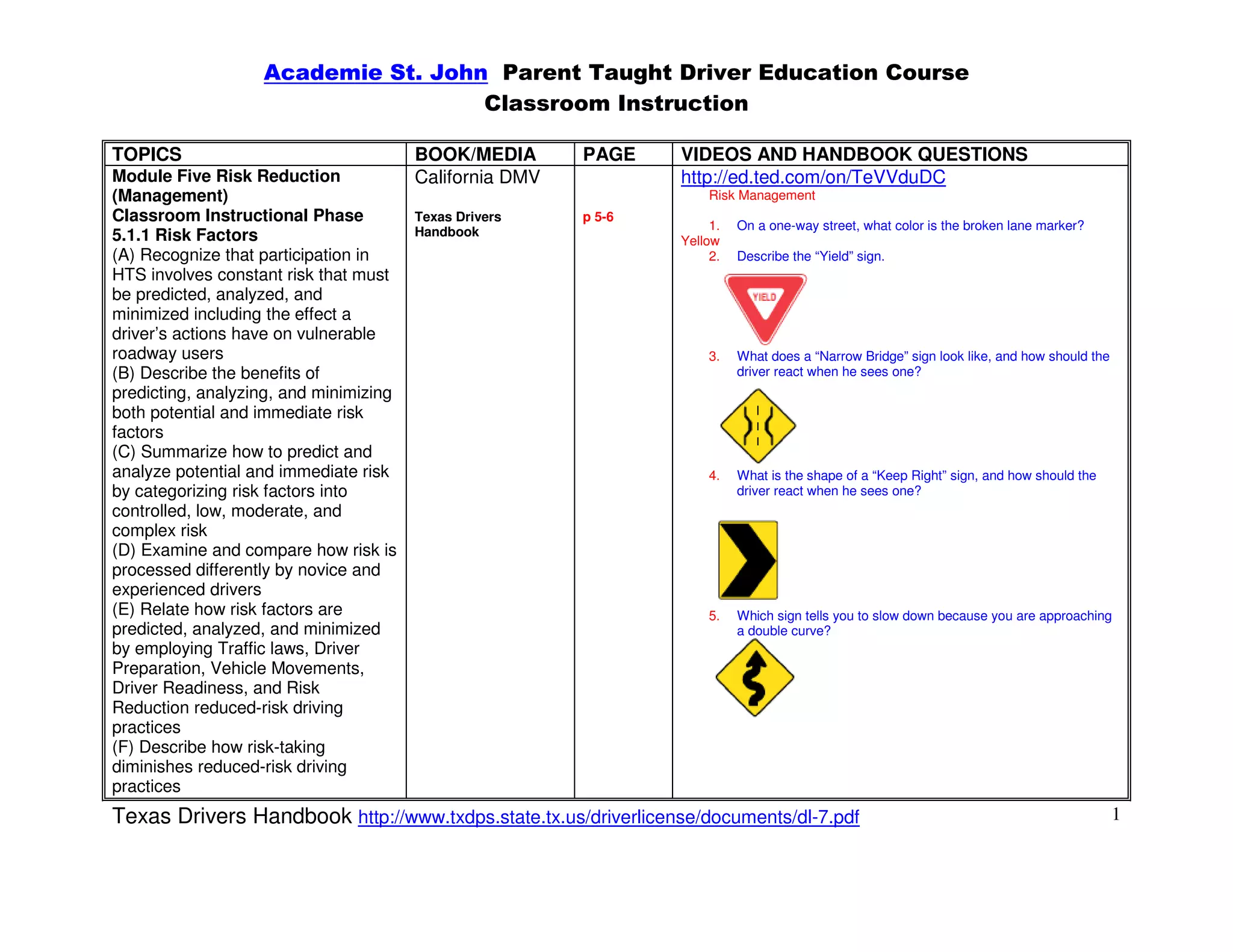 This document provides an overview of a driver education course module on risk reduction and space management. It outlines topics that will be covered, including recognizing risk factors, predicting and analyzing risk, employing safe driving practices, the impact of distractions, and crash statistics. Sample questions are provided from the Texas Driver's Handbook on traffic signs, signals, and scenarios to assess understanding of risk management concepts.