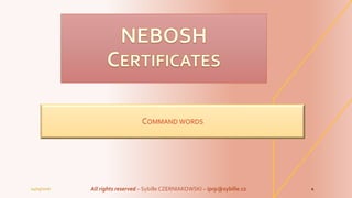 This document provides guidance on common command words used in questions for health and safety exams. It outlines what each command word is testing and what is expected in an answer. Some of the command words discussed are identify, outline, describe, explain, and give. For each word, the document explains how to answer questions using that command word and provides an example question and answer.