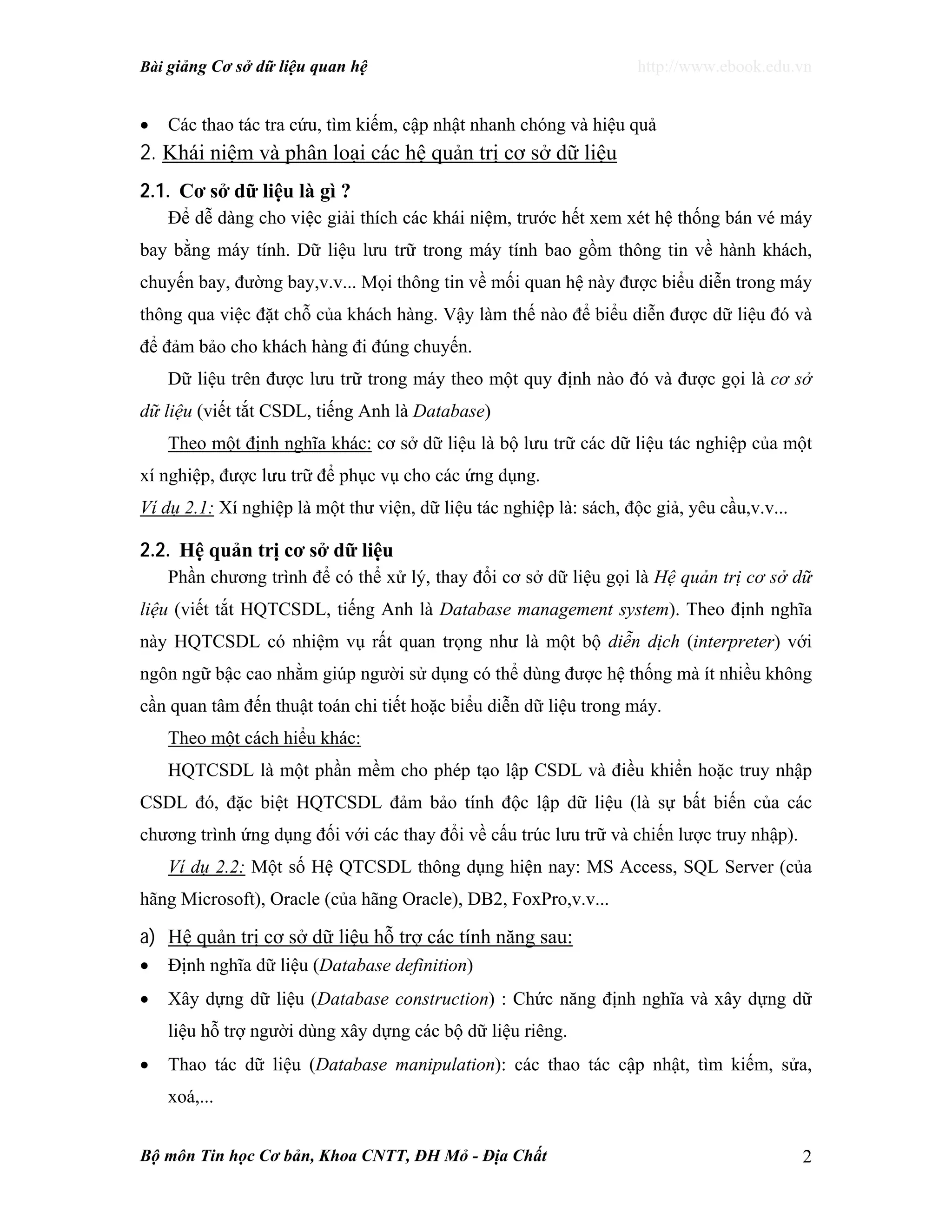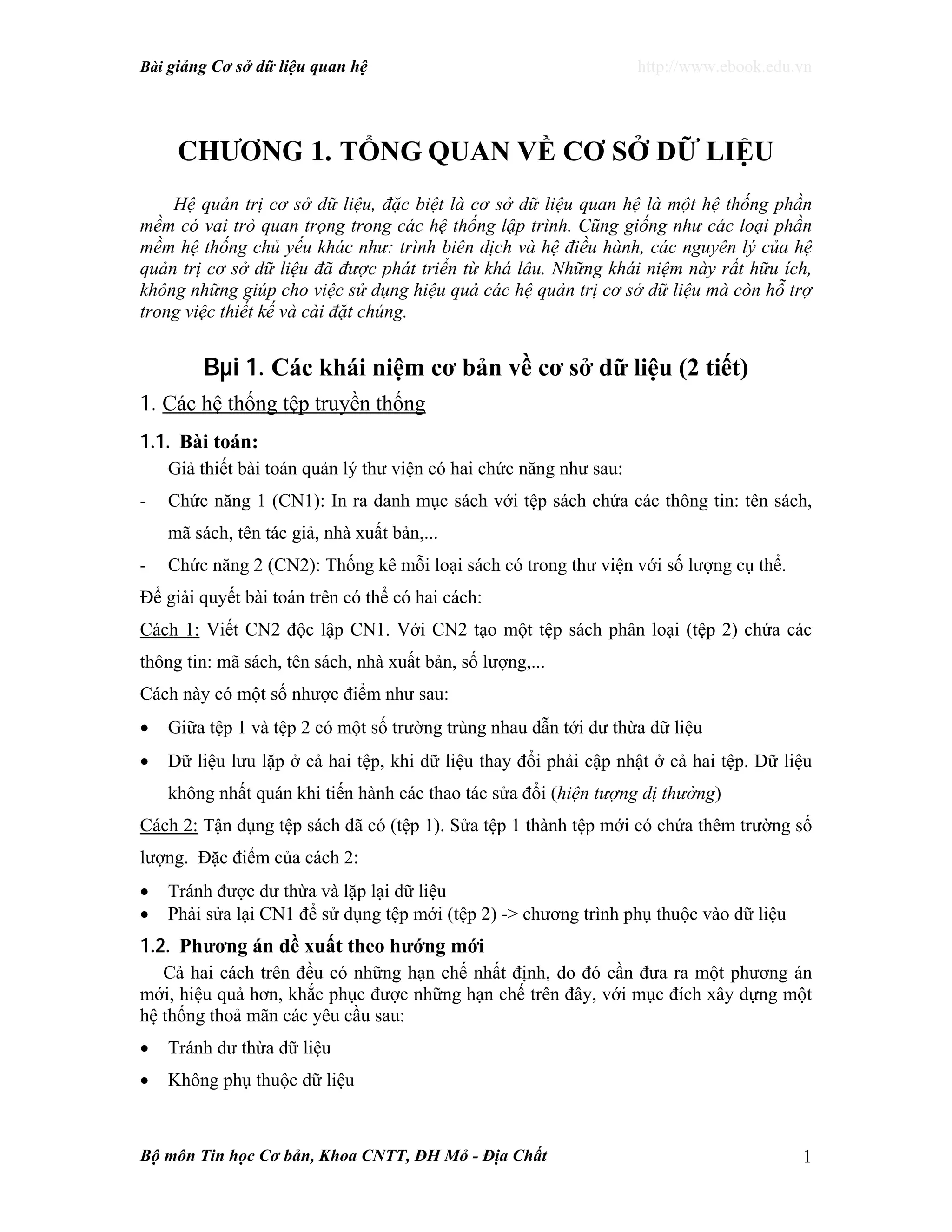 Tài liệu giới thiệu tổng quan về cơ sở dữ liệu và hệ quản trị cơ sở dữ liệu, nhấn mạnh vai trò quan trọng của chúng trong lập trình. Nó đề cập đến các khái niệm cơ bản, phương pháp quản lý dữ liệu, và các loại hệ quản trị cơ sở dữ liệu khác nhau. Cuối cùng, văn bản bàn về kiến trúc ba mức của hệ cơ sở dữ liệu và những lợi ích mà nó mang lại.