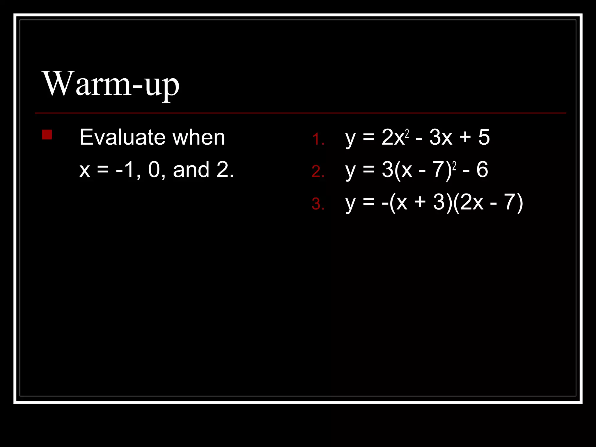 This document discusses quadratic functions and their graphs. It defines a quadratic function as having the form y = ax2 + bx + c. The graph of a quadratic function is a parabola, which has a vertex (lowest or highest point) and an axis of symmetry (vertical line through the vertex). It provides examples of graphing different quadratic functions using a graphing calculator and by hand, including how to find and plot the vertex and axis of symmetry.
