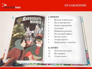Документ описывает проект «12 месяцев», организованный для знакомства сотрудников компании Bayer с безрецептурными препаратами через интерактивные мероприятия. Цели мероприятия включали повышение заинтересованности сотрудников и формирование командного духа, что осуществлялось через игру, презентации, награждения и тимбилдинг. Полученные результаты включают рост лояльности к бренду и опыт, который будет использоваться в будущих деловых мероприятиях.