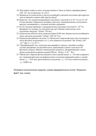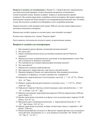 Документ содержит задания для самопроверки по лекции о энергии фотона, включая вопросы различного уровня сложности. Учащиеся должны предоставить подробные ответы и могут отправлять задания в формате Word или в рукописном виде. Каждое задание охватывает материалы лекции и требует анализа физических явлений, связанных со светом и фотонами.