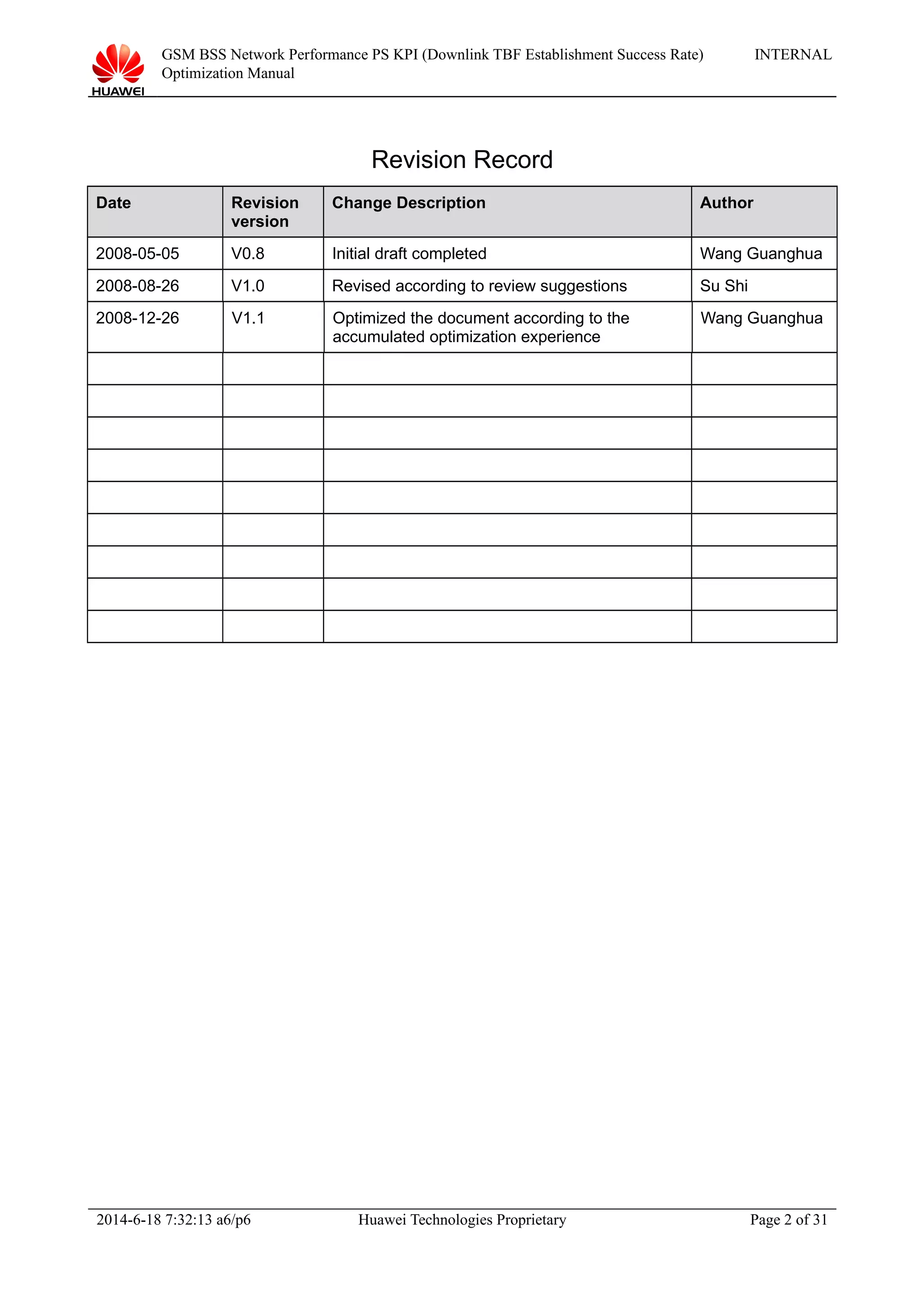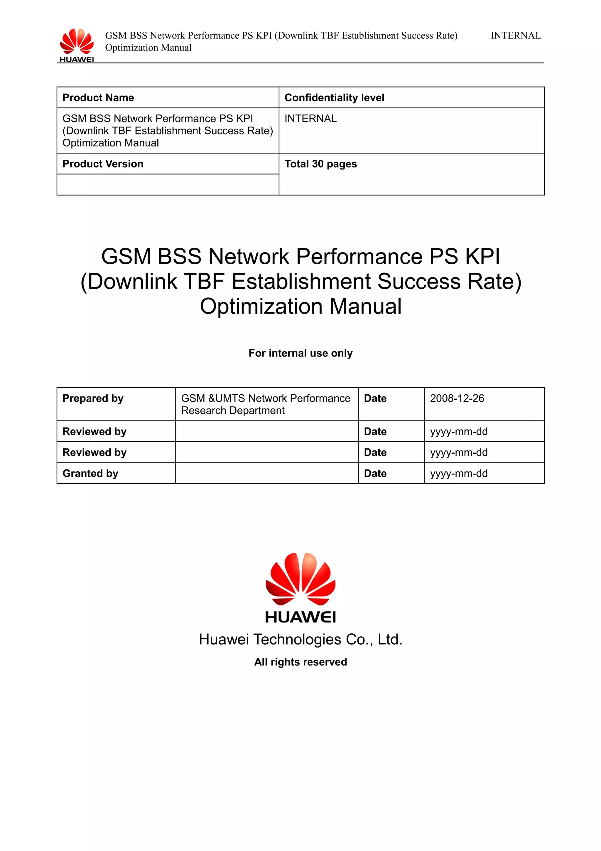 This document provides a manual for optimizing the downlink TBF establishment success rate in GSM BSS networks. It describes how to collect statistics on the downlink TBF establishment success rate and methods for optimizing it. The document discusses checking the Abis link, delivery of assignment messages, air interface, failed downlink TBF establishments due to issues like overloaded control channels, lack of channel resources, improper parameter configurations, incorrect information elements, and imbalance between the uplink and downlink.