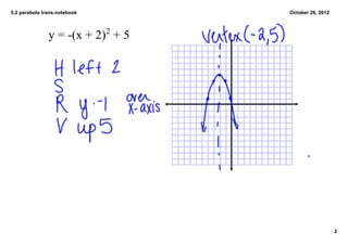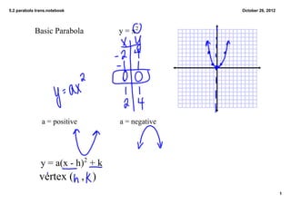 This document discusses parabolas in the form of y=ax^2+bx+c and describes how changing the values of a, b, and c affects the graph of the parabola. It provides 4 examples of parabolas with different values of a, showing how a positive or negative a value determines whether the parabola opens up or down and how the h and k values of the vertex formula (h, k) determine the location and orientation of the parabola.