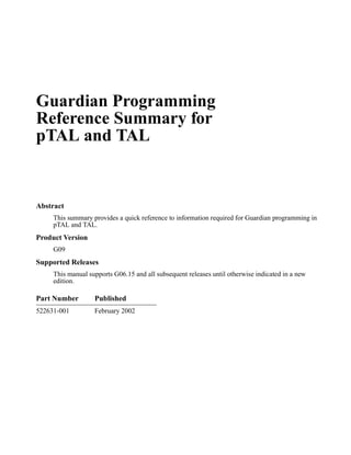 This document provides a quick reference to information required for Guardian programming in pTAL and TAL, including process name and ID formats, file codes, device types and subtypes, procedure call summaries, CONTROL operations, SET^FILE operations, SETMODE operations, completion codes, traps, interprocess messages, error codes, and the ASCII character set. It supports G06.15 and subsequent releases until a new edition is published.