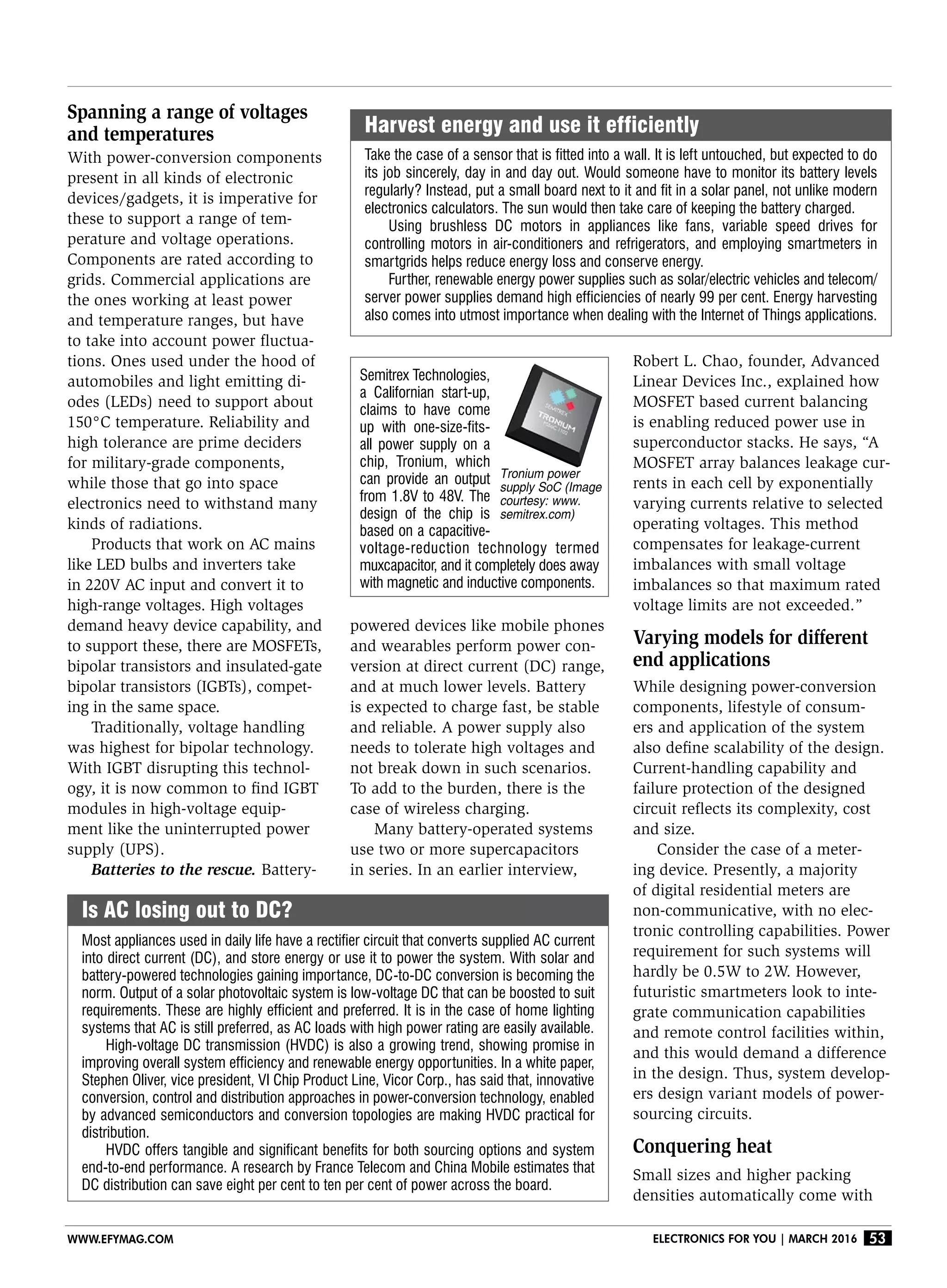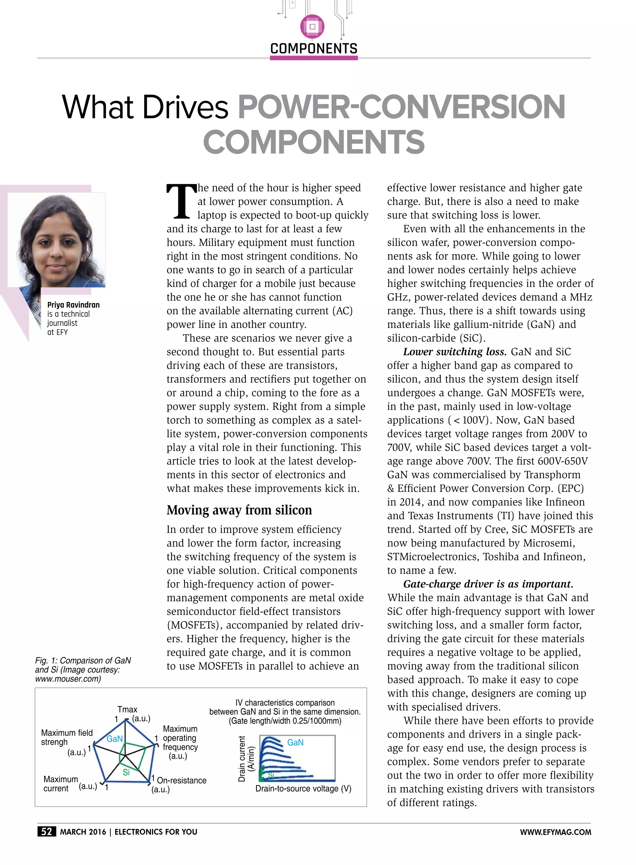 This document discusses recent developments in power-conversion components for electronics. It begins by noting the need for higher speeds and lower power consumption in devices like laptops and military equipment. It then discusses how new materials like gallium nitride and silicon carbide allow for higher switching frequencies and lower losses compared to silicon. These new materials are being used in power MOSFETs and IGBTs. The document also notes the need for power-conversion components to operate over a wide range of voltages and temperatures depending on the application. It discusses some challenges in designing components for applications like smart meters and challenges of reducing size while managing heat.