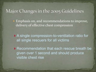 The document outlines updated recommendations for administering CPR, emphasizing effective chest compressions and a unified compression-to-ventilation ratio of 30:2 for all age groups. It stresses the importance of initiating CPR early to increase the effectiveness of defibrillation and highlights details on ventilation techniques and pulse checks. Additionally, the document compares CPR techniques for adults, children, and infants, providing guidelines for hand placement, compression depth, and rescue breathing rates.