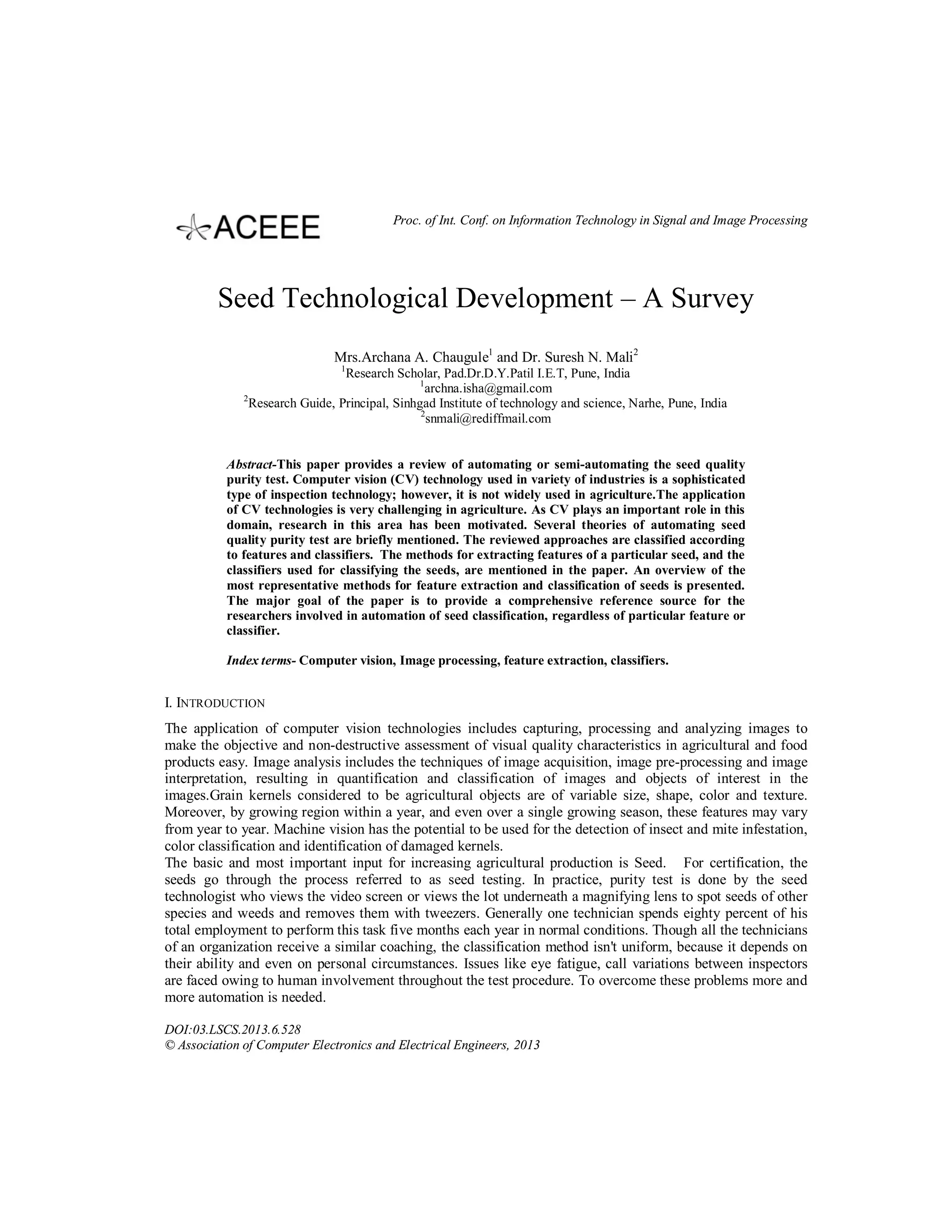 This document reviews the automation of seed quality purity tests using computer vision technology, highlighting its potential and challenges in agriculture. It categorizes various research methods for feature extraction and classification of seeds based on characteristics such as size, shape, color, and texture, providing a comprehensive reference for researchers in this field. The paper emphasizes the need for automation to reduce human error in seed testing, which currently relies heavily on manual inspection.