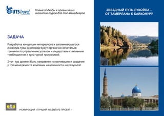 Документ описывает концепцию инсентив-тура для топ-менеджеров компании Лукойл под названием «Звездный путь Лукойла – от Тамерлана к Байконуру», который включает тренинги по управлению успехом и лидерству, культурные программы и активный тимбилдинг. Тур проходит в течение трех дней в Кызылорде и Байконуре и включает различные казахские игры, культурные мероприятия и наблюдение за запуском космического аппарата. Основная цель – мотивировать топ-менеджеров нацеленности на результат через уникальные впечатления и командное взаимодействие.