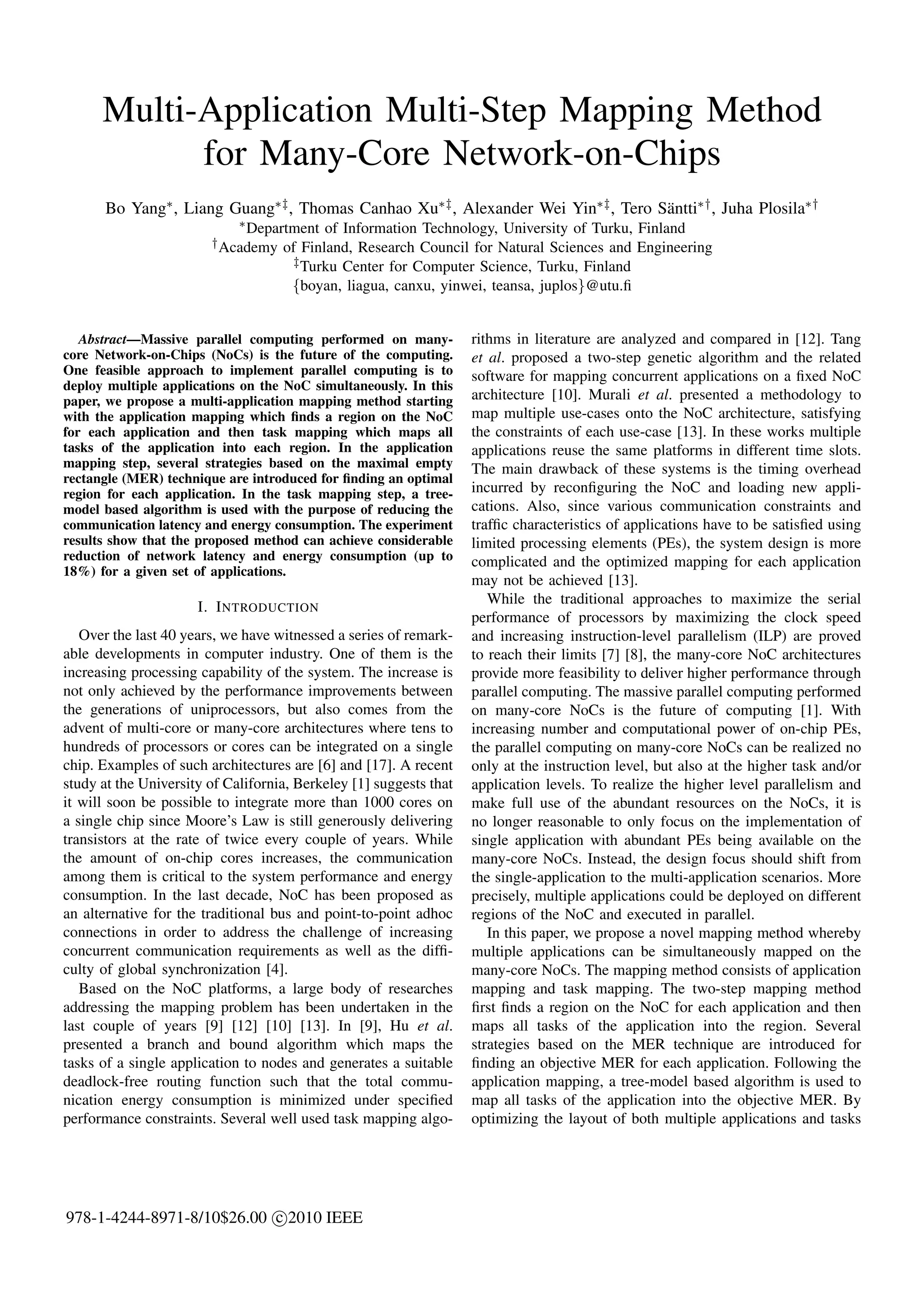 This document proposes a multi-application multi-step mapping method for mapping multiple applications simultaneously onto a many-core Network-on-Chip (NoC). The method consists of two steps: 1) an application mapping step that finds a region on the NoC for each application using maximal empty rectangle techniques, and 2) a task mapping step that maps the tasks of each application within its region to minimize communication latency and energy consumption. The method aims to optimize the layout of applications and tasks to reduce network latency and energy usage for multi-application mapping on many-core NoCs.