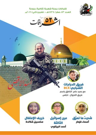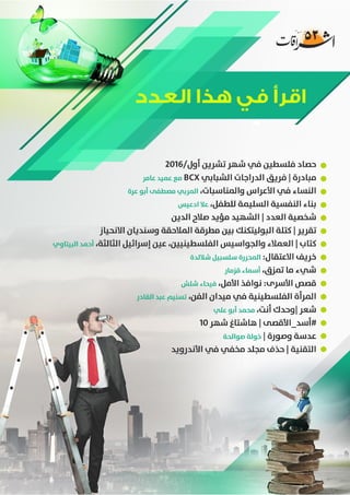 مجلة شهرية ثقافية شبابية تقرؤون في هذا العدد حصاد فلسطين في شهر تشرين أول/2016 مبادرة | فريق الدراجات الشبابي BCX مع عميد عامر، نابلس النساء في الأعراس والمناسبات، المربي مصطفى أبو عرة، طوباس بناء النفسية السليمة للطفل، علا ادعيس، الخليل شخصية العدد | الشهيد مؤيد صلاح الدين تقرير | كتلة البوليتكنك بين مطرقة الملاحقة وسنديان الانحياز كتاب | العملاء والجواسيس الفلسطينيين، عين إسرائيل الثالثة، أحمد البيتاوي، نابلس خريف الاعتقال: المحررة سلسبيل شلالدة، الخليل شيء ما تمزق، أسماء قزمار، نابلس قصص الأسرى: نوافذ الأمل، فيحاء شلش، رام الله المرأة الفلسطينية في ميدان الفن، تسنيم عبد القادر، نابلس شعر |وحدك أنت، محمد أبو علي، جنين #أسد_الأقصى | هاشتاغ شهر 10 عدسة وصورة | خولة صوالحة التقنية | حذف مجلد مخفي في الأندرويد