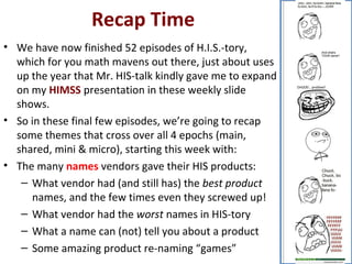 This document discusses product naming in the healthcare IT industry. It begins by praising Shared Medical Systems (SMS) for having the best product names, including "Focus", "Command", and "Invision". However, it notes a few missteps like "The Spirit Choice". The document also criticizes McKesson's tendency to use bland acronyms for product names like "HFC" and "HDC". It concludes by teasing next week's discussion on additional notable product names and naming conventions.