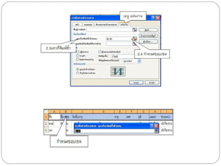 การเลื่อนต่างหน้าจอภาพ 1) การตรึงแนว เพื่อใช้ในมุมมองหน้าต่อไป 1.1) คลิกเมนู หน้าต่าง เลือก ตรึงแนว 1.2) ให้ทดสอบเลื่อนหน้าต่างจอภาพขึ้น 1.3) จะพบว่า หน้าต่างจอภาพ จะเลื่อนเฉพาะข้อมูล แต่หัวเรื่องยังคงอยู่กับที่ 2) การสร้างหัวแถวพิมพ์ซ้ำ เพื่อใช้สร้างหัวตารางหน้าต่อไป 2.1) คลิกเมนู แฟ้ม ( File) เลือก ตั้งค่าหน้ากระดาษ ( page setUp) 2.2) เลือกเมนู แผ่นงาน 2.3) เลือกกลุ่ม ชื่อเรื่องที่พิมพ์ เลือก แถวที่จะพิมพ์ซ้ำด้านบน 2.4) กำหนดขอบเขตแถวที่จะพิมพ์ซ้ำในหน้าต่อๆไป 2.5) ตอบ ตกลง ( OK.) - 13.