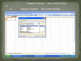 53011213097 1. การใช้ Microsoft Excel ในการคำนวณทางการเงิน การใช้ Microsoft Excel ในการคำนวณค่าของเงินตามเวลา สามารถทำได้โดยเริ่มต้นจากการเปิดโปรแกรม Microsoft Excel และเลือก Menu Insert (แทรก) ตามด้วย Function (ฟังก์ชั่น) ดังภาพ 1.1 ภาพ 1.1 หน้าจอ Microsoft Excel และการเลือก Menu Insert Function 2. 3. เมื่อทำการเลือก Category: Financial แล้ว ใน Menu Box จะขึ้นรายการคำนวณทางการเงินต่าง ๆ ขึ้นมา ซึ่งสามารถใช้รายการต่าง ๆ เหล่านี้ในการคำนวณทางการเงินได้1. วิธีการหามูลค่าปัจจุบัน หากต้องการคำนวณมูลค่าปัจจุบัน (Present Value) ให้ทำการเลือกรายการ PV ดังภาพ 1.3 ภาพ 1.3 การเลือกทำรายการคำนวณหามูลค่าปัจจุบัน 4. โปรแกรม Microsoft Excel จะขึ้นกล่องแสดง Function Arguments ขึ้มาเพื่อให้ทำการใส่ค่าพารามิเตอร์ (Parameter) ดังภาพ 1.4 ภาพ 1.4 Function Arguments 5. Function Arguments ค่า Parameters คำอธิบายค่า Parameters ต่าง ๆค่าพารมิเตอร์ของการคำนวณหามูลค่าปัจจุบัน มีทั้งหมด 5 ค่า คือRate แสดงถึงอัตราดอกเบี้ยต่อปีNperแสดงถึงจำนวนงวดทั้งหมดของการลงทุนPmt แสดงถึงจำนวนเงินต่องวด (ค่านี้จะใส่เมื่อมีการจ่ายหรือรับเงินจำนวนเงินเท่า ๆ กันเป็นรายงวดเท่านั้น หากไม่มีการจ่ายหรือรับเงินเป็นรายงวด จะไม่ใส่ค่านี้) FV แสดงถึงมูลค่าของเงินในอนาคตที่จะใช้ในการคำนวณหามูลค่าปัจจุบันType แสดงถึงลักษณะของการจ่ายหรือรับเงิน เช่น ต้นงวด หรือปลายงวด (หากไม่ใส่ค่าใดระบบจะทำการคำนวณเป็นการจ่ายสิ้นงวดโดยอัตโนมัติ) ตัวอย่างที่ 1 หากมีคนสัญญากับเราว่าจะมอบเงินให้กับเราในอีก 5 ปีข้างหน้า เป็นจำนวนเงิน 10,000 บาท ถ้าวันนี้อัตราดอกเบี้ยในท้องตลาดเท่ากับ 5% ต่อปี เงินที่เราจะได้รับในอีก 5 ปี ข้างหน้าจะมีมูลค่าเท่ากับเท่าใดในปัจจุบันการแทนค่าพารามิเตอร์นั้นสามารถทำได้โดยRate = 5% FV = 10,000 บาท Pmt = 0 (เนื่องจากไม่มีเงินรายงวด) Nper = 5 ปี Type = 0 (หรือไม่ใส่ค่าใด ก็ได้) 6. ภาพ 1.5 การแทนค่าพารามิเตอร์ต่าง ๆ และผลลัพท์จากการคำนวณ โดยโปรแกรม Microsoft Excel จะทำการคำนวณหามูลค่าปัจจุบันให้ทันที โดยมีมูลค่าปัจจุบันเท่ากับ 7,835.26 บาท ระบบจะทำการคำนวณมูลค่าปัจจุบันให้ทราบทันที 7. ตัวอย่างที่ 2 หากมีคนสัญญากับเราว่าจะมอบเงินให้กับเราทุกสิ้นปี เป็นระยะเวลา 5 ปี เป็นจำนวนเงิน 2,000 บาทต่อปี ถ้าวันนี้อัตราดอกเบี้ยในท้องตลาดเท่ากับ 5% ต่อปี เงินที่เราจะได้รับในอนาคต ข้างหน้าจะมีมูลค่าเท่ากับเท่าใดในปัจจุบันการแทนค่าพารามิเตอร์นั้นสามารถทำได้โดยRate = 5% FV = 0 บาท Pmt = 2,000 บาทNper = 5 ปี Type = 0 (หรือไม่ใส่ค่าใด ก็ได้) Microsoft Excel จะทำการคำนวณหามูลค่าปัจจุบันให้ทันที โดยมีมูลค่าปัจจุบันเท่ากับ 8,658.95 บาทภาพ 1.6 การแทนค่าพารามิเตอร์ต่าง ๆ และผลลัพท์จากการคำนวณ โดยโปรแกรม 8. 9. โปรแกรม Microsoft Excel จะขึ้นกล่องแสดง Function Arguments ขึ้มาเพื่อให้ทำ