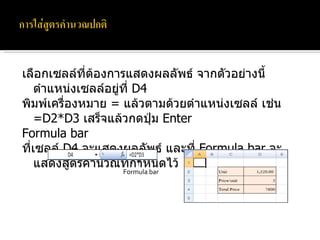 53011213099 1. 2. 3. āļāļēāļĢāļāļģāļāļ§āļāđāļāđāļāļĢāļ·āđāļāļāļāļāļĄāļāļīāļ§āđāļāļāļĢāđāļāļąāļāļāļēāļĢāļāļģāļāļ§āļāļāļēāļāđāļāļĢāļ·āđāļāļāļāļīāļāđāļĨāļ āļāļĨāļĨāļąāļāļāđāļāļĩāđāđāļāđāļāļ°āļāđāļēāļāļāļąāļ āđāļāļ·āđāļāļāļāļēāļāļāļēāļĢāļāļģāļāļ§āļāđāļāđāļāļĢāļ·āđāļāļāļāļāļĄāļāļīāļ§āđāļāļāļĢāđ āđāļāļĢāđāļāļĢāļĄāļāļ°āļāļđāļāļ§āļēāļĄāļŠāļģāļāļąāļāļāļāļāđāļāļĢāļ·āđāļāļāļŦāļĄāļēāļĒāļāļēāļāļāļēāļĢāļāļģāļāļ§āļāļāđāļ§āļĒ āļāļķāļāđāļāđāļāļŠāļīāđāļāļŠāļģāļāļąāļāļāļĒāđāļēāļāļĒāļīāđāļāļāļĩāđ user āļāļ°āļāđāļāļāļāļĢāļēāļāđāļāđāļĢāļ·āđāļāļāļāļĩāđ āđāļāļ·āđāļāđāļĄāđāđāļŦāđāļāļĨāļĨāļąāļāļāđāļāļĩāđāļāđāļāļāļāļēāļĢāļāļīāļāđāļāļĩāđāļĒāļāđāļāļāļēāļāļāļāļāļī āļāļ§āļēāļĄāļŠāļģāļāļąāļāļāļāļāđāļāļĢāļ·āđāļāļāļŦāļĄāļēāļĒāļāļēāļāļāļēāļĢāļāļģāļāļ§āļ āļāļ°āđāļĨāđāļāļēāļāļāļāļĨāļāļĨāđāļēāļ āļāļāļŠāļļāļāļāļ°āļŠāļģāļāļąāļāļŠāļđāļāļŠāļļāļ āđāļĨāļ°āļĨāđāļēāļāļŠāļļāļāļāļ°āļŠāļģāļāļąāļāļāđāļģāļŠāļļāļ āđāļāļŠāļđāļāļĢāļāļģāļāļ§āļāļŠāļđāļāļĢāļŦāļāļķāđāļ āļāđāļēāđāļāļĢāļ·āđāļāļāļŦāļĄāļēāļĒāđāļāļŠāļģāļāļąāļāļāļ§āđāļēāļāđāļāļ°āļāļģāļāļēāļĢāļāļģāļāļ§āļāđāļāļĢāļ·āđāļāļāļŦāļĄāļēāļĒāļāļąāđāļāļāđāļāļāđāļĨāđāļ§āđāļĨāđāļāļēāļĄāļĨāļģāļāļąāļāđāļāđāļĢāļ·āđāļāļĒāđ āļāļ§āļēāļĄāļŠāļģāļāļąāļāļāļāļāđāļāļĢāļ·āđāļāļāļŦāļĄāļēāļĒāļāļēāļāļāļēāļĢāļāļģāļāļ§āļ āļāļ°āđāļĨāđāļāļēāļāļāļāļĨāļāļĨāđāļēāļ āļāļāļŠāļļāļāļāļ°āļŠāļģāļāļąāļāļŠāļđāļāļŠāļļāļ āđāļĨāļ°āļĨāđāļēāļāļŠāļļāļāļāļ°āļŠāļģāļāļąāļāļāđāļģāļŠāļļāļ āđāļāļŠāļđāļāļĢāļāļģāļāļ§āļāļŠāļđāļāļĢāļŦāļāļķāđāļ āļāđāļēāđāļāļĢāļ·āđāļāļāļŦāļĄāļēāļĒāđāļāļŠāļģāļāļąāļāļāļ§āđāļēāļāđāļāļ°āļāļģāļāļēāļĢāļāļģāļāļ§āļāđāļāļĢāļ·āđāļāļāļŦāļĄāļēāļĒāļāļąāđāļāļāđāļāļāđāļĨāđāļ§āđāļĨāđāļāļēāļĄāļĨāļģāļāļąāļāđāļāđāļĢāļ·āđāļāļĒāđ āļāļ§āļēāļĄāļŠāļģāļāļąāļāļāļāļāđāļāļĢāļ·āđāļāļāļŦāļĄāļēāļĒāļāļēāļāļāļēāļĢāļāļģāļāļ§āļ āļāļ°āđāļĨāđāļāļēāļāļāļāļĨāļāļĨāđāļēāļ āļāļāļŠāļļāļāļāļ°āļŠāļģāļāļąāļāļŠāļđāļāļŠāļļāļ āđāļĨāļ°āļĨāđāļēāļāļŠāļļāļāļāļ°āļŠāļģāļāļąāļāļāđāļģāļŠāļļāļ āđāļāļŠāļđāļāļĢāļāļģāļāļ§āļāļŠāļđāļāļĢāļŦāļāļķāđāļ āļāđāļēāđāļāļĢāļ·āđāļāļāļŦāļĄāļēāļĒāđāļāļŠāļģāļāļąāļāļāļ§āđāļēāļāđāļāļ°āļāļģāļāļēāļĢāļāļģāļāļ§āļāđāļāļĢāļ·āđāļāļāļŦāļĄāļēāļĒāļāļąāđāļāļāđāļāļāđāļĨāđāļ§āđāļĨāđāļāļēāļĄāļĨāļģāļāļąāļāđāļāđāļĢāļ·āđāļāļĒāđ āđāļāļĢāļ·āđāļāļāļŦāļĄāļēāļĒāļāļĩāđāđāļāđ āļāļ§āļēāļĄāļŦāļĄāļēāļĒ ( ) āļ§āļāđāļĨāđāļ ^ āļĒāļāļāļģāļĨāļąāļ * , / āļāļđāļ , āļŦāļēāļĢ + , - āļāļ§āļ , āļĨāļ 4. 5. āđāļāļĢāđāļāļĢāļĄ Excel āļāļ°āļāļģāļāļēāļĢāđāļāđāļāļāļļāļāļāļāļāļŠāļđāļāļĢāļāļģāļāļ§āļāļāļēāļĄāļāļĢāļ°āđāļ āļāļāļēāļĢāđāļāđāļāļēāļ āļāđāļēāļāļļāļāļāđāļāļāļāļēāļĢāđāļāđāļŠāļđāļāļģāļāļ§āļāļāļĢāļ°āđāļ āļāđāļ āļāļĨāļīāļāđāļĨāļ·āļāļāļāļļāđāļĄāļāļąāđāļāđāļāđāđāļĨāļĒ āļŦāļĢāļ·āļāļāļĨāļīāļāļāļļāđāļĄ Insert Function āļāđāđāļāđ āļŠāļđāļāļĢāļāļģāļāļ§āļāļāļĩāđāļāļģāļĄāļēāļĒāļāļāļąāļ§āļāļĒāđāļēāļāļāļ°āđāļāđāļāļŠāļđāļāļĢāļāļĩāđāđāļāđāļāļēāļāļāđāļāļĒāđ āļĄāļĩāļāļąāđāļāļāļāļāļāļąāļāļāļĩāđ āđāļĨāļ·āļāļāđāļāļĨāļĨāđāļāļĩāđāļāđāļāļāļāļēāļĢāđāļŠāļāļāļāļĨāļĨāļąāļāļāđ āļāļēāļāļāļąāļ§āļāļĒāđāļēāļāļāļĩāđ āļāļģāđāļŦāļāđāļāđāļāļĨāļĨāđāļāļĒāļđāđāļāļĩāđ C13 āļāļĩāđāđāļāđāļ Formula āļāļ°āđāļŠāļāļāļāļĢāļ°āđāļ āļāļāļāļāļŠāļđāļāļĢāļāļģāļāļ§āļāđāļŦāđāđāļĨāļ·āļāļāđāļāđ āđāļāļāļĩāđāļāļĩāđāļāļĨāļīāļāļāļļāđāļĄāļĨāļđāļāļĻāļĢāļĨāļāļāļāļ AutoSum 6.
