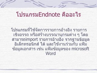 การเพิ่มบรรณานุกรม : direct export จากฐานข้อมูลต่าง ๆ Web of science 1 2 3 เลือกเรื่องที่ต้องการ คลิกที่ save to Endnote เลือกไลบราลี่ที่ต้องการ คลิกที่ปุ่ม open