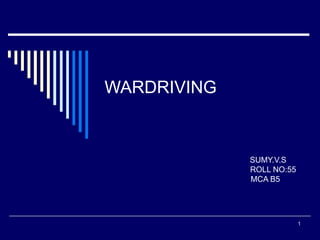 WarDriving involves using a vehicle or walking to detect and map wireless networks in an area. It originated from the term "WarDialing" which was popularized in the movie WarGames. A typical WarDriver uses a laptop or PDA equipped with wireless detection software like NetStumbler, MiniStumbler, or Kismet to passively detect network access points and log their locations. The results are often mapped to analyze wireless security issues and raise awareness, though some legal questions remain about temporarily associating with networks without permission.