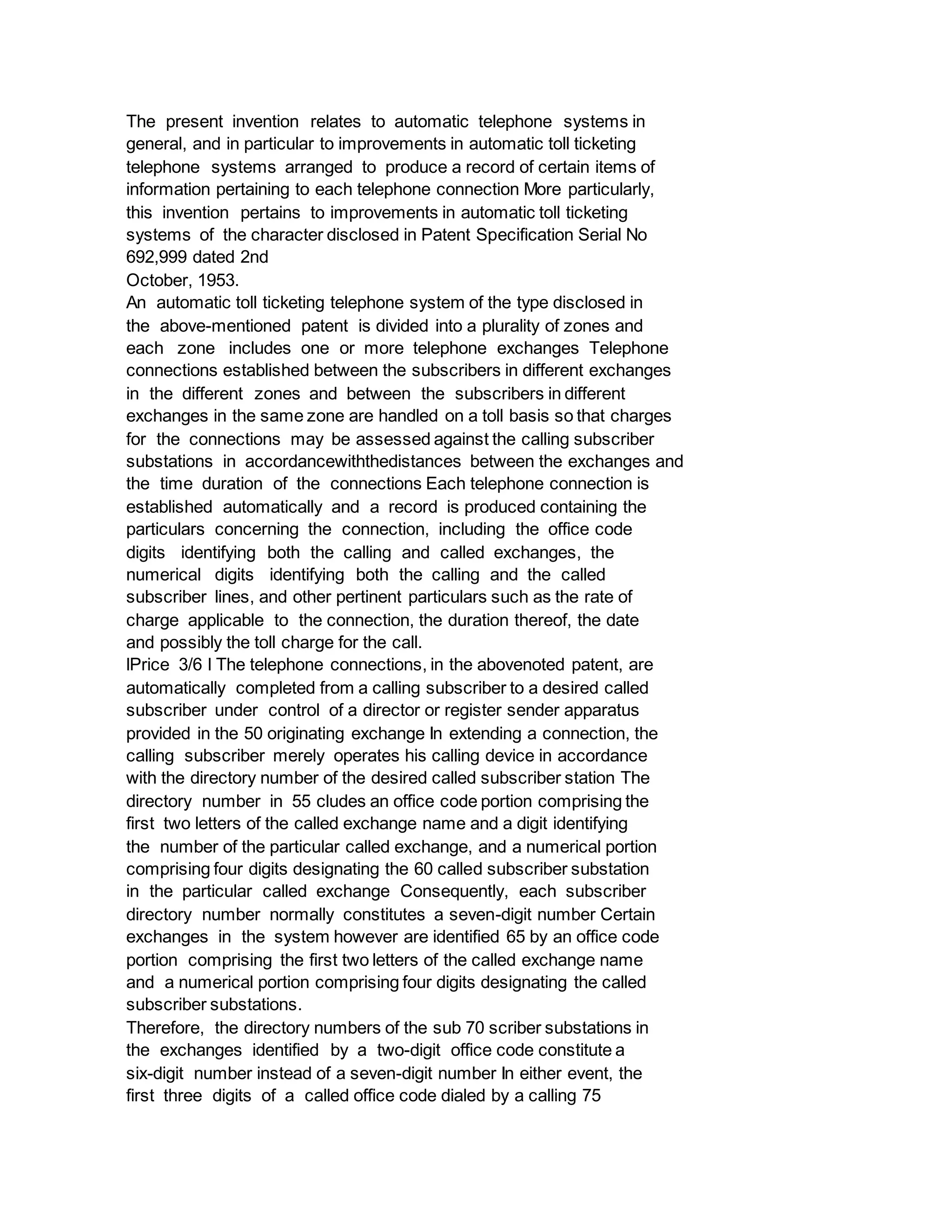 This document describes an automatic toll ticketing system that improves on prior systems by removing certain apparatus, including a switching mechanism, from each register sender and making it available to multiple register senders. Specifically, it provides common office code translating apparatus that can be selected for exclusive use by a register sender to translate an office code into routing digits to route the call. It also allows charging the called subscriber instead of the calling subscriber by using a special office code.