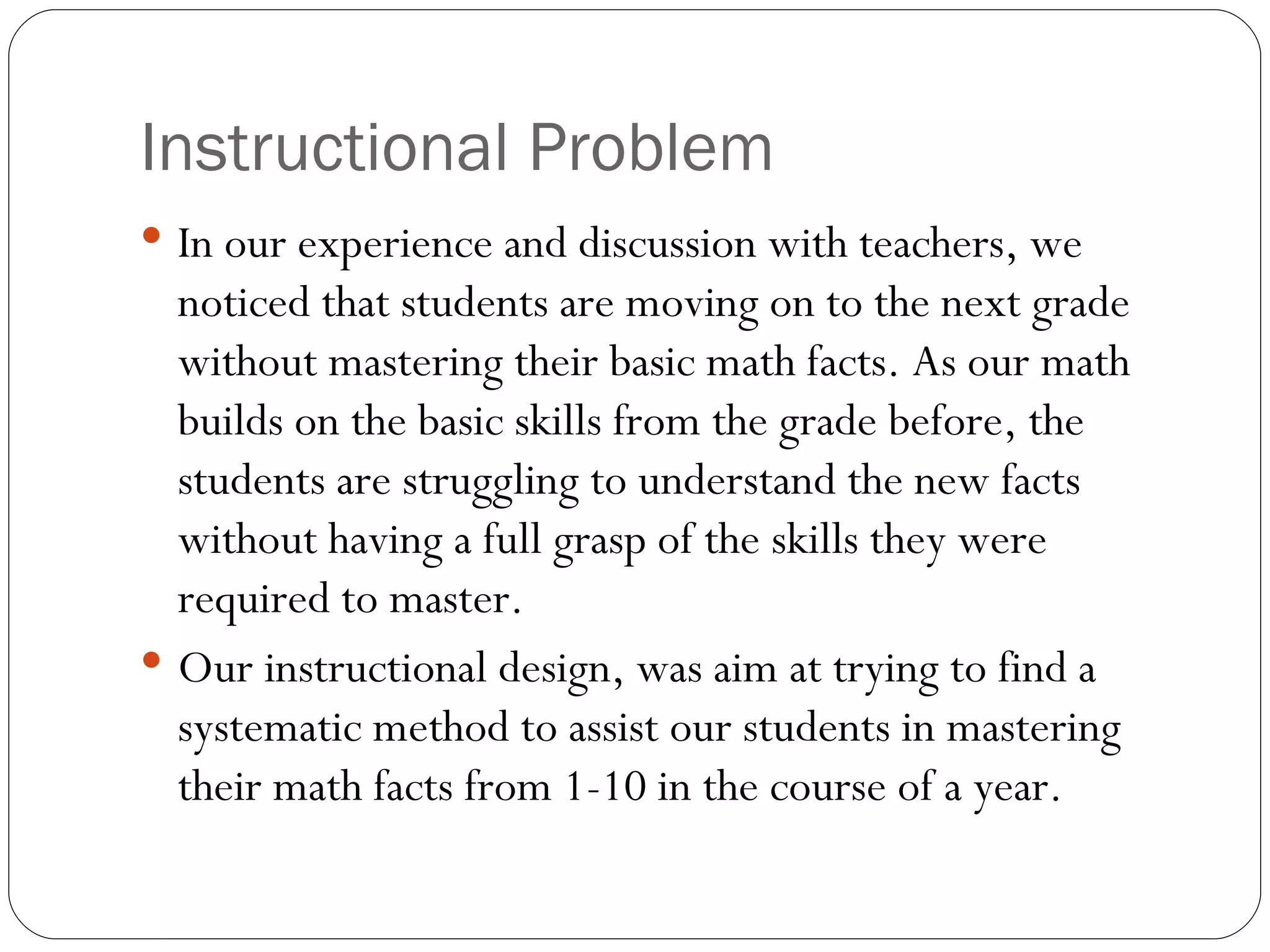 The document discusses developing an instructional plan to help students master basic math facts from 1-10 in the first grade. The plan includes weekly lessons focusing on addition and subtraction math fact families, formative and summative assessments, and using manipulatives and technology. Students will learn a new fact family each week and have opportunities to practice on websites. Progress will be monitored through tests, observations, and student conferences.