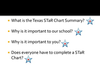 The document discusses the Texas STaR Chart, which is a survey that schools use to summarize their use and effectiveness of technology. The STaR Chart evaluates four key areas - Teaching and Learning, Educator Preparation and Development, Leadership/Administration/Instructional Support, and Infrastructure for Technology. It is important for schools to complete the STaR Chart to help plan technology improvements and communicate their technology status to administrators and the state. All teaching personnel at a school are expected to complete the survey to provide an accurate view of the school's technology.