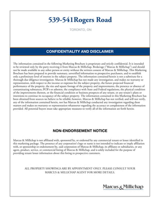 This offering memorandum provides information on a multi-unit residential and retail property located at 539-541 Rogers Road in Toronto, Ontario. The 1,800 square foot property consists of 900 square feet of apartments and 900 square feet of retail space. Current annual net operating income is a loss of $3,327 due to the majority of the building being owner occupied. The memorandum estimates that fully leasing the property could generate $16,773 in annual net operating income. Confidentiality of the information is noted, and potential buyers are advised to verify all details.