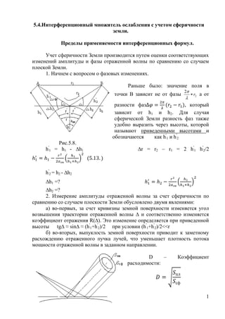 Документ рассматривает влияние сферичности Земли на интерференционные множители ослабления волн, подчеркивая важность учета изменений амплитуды и фазы отраженных волн. Обсуждаются соотношения между высотой и фазовыми изменениями, а также влияние кривизны поверхности на угол возвышения и коэффициент отражения. Ограничения применения интерференционных формул определяются длиной трасс и условиями приема сигналов.