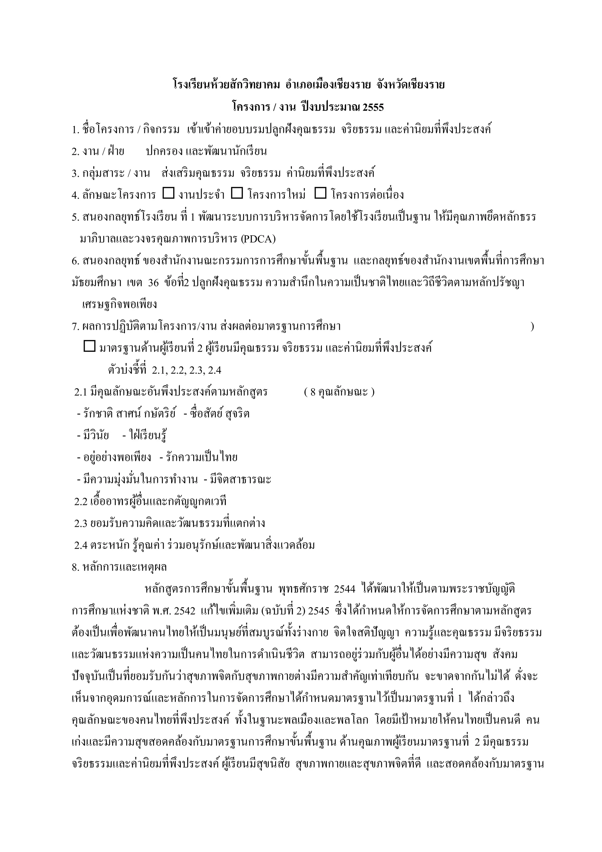จังหวัดเชียงราย โครงการ / งาน ปี งบประมาณ 2555 1. ชื่อโครงการ / กิจกรรม เข้าเข้าค่ายอบบรมปลูกฝังคุณธรรม จริ ยธรรม และค่านิยมที่พึงประสงค์ 2. งาน / ฝ่ าย ปกครอง และพัฒนานักเรี ยน 3. กลุ่มสาระ / งาน ส่งเสริ มคุณธรรม จริ ยธรรม ค่านิยมที่พึงประสงค์ 4. ลักษณะโครงการ งานประจา โครงการใหม่ โครงการต่อเนื่อง 5. สนองกลยุทธ์โรงเรี ยน ที่ 1 พัฒนาระบบการบริ หารจัดการโดยใช้โรงเรี ยนเป็ นฐาน ให้มีคุณภาพยึดหลักธรร มาภิบาลและวงจรคุณภาพการบริ หาร (PDCA) 6. สนองกลยุทธ์ ของสานักงานณะกรรมการการศึกษาขั้นพื้นฐาน และกลยุทธ์ของสานักงานเขตพื้นที่การศึกษา มัธยมศึกษา เขต 36 ข้อที2 ปลูกฝังคุณธรรม ความสานึกในความเป็ นชาติไทยและวิถีชีวิตตามหลักปรัชญา ่ เศรษฐกิจพอเพียง 7. ผลการปฏิบติตามโครงการ/งาน ส่งผลต่อมาตรฐานการศึกษา ั ) มาตรฐานด้านผูเ้ รี ยนที่ 2 ผูเ้ รี ยนมีคุณธรรม จริ ยธรรม และค่านิยมที่พึงประสงค์ ตัวบ่งชี้ที่ 2.1, 2.2, 2.3, 2.4 2.1 มีคุณลักษณะอันพึงประสงค์ตามหลักสูตร ( 8 คุณลักษณะ ) - รักชาติ สาศน์ กษัตริ ย ์ - ซื่อสัตย์ สุจริ ต - มีวินย - ใฝ่ เรี ยนรู้ ั - อยูอย่างพอเพียง - รักความเป็ นไทย ่ - มีความมุ่งมันในการทางาน - มีจิตสาธารณะ ่ 2.2 เอื้ออาทรผูอื่นและกตัญญูกตเวที ้ 2.3 ยอมรับความคิดและวัฒนธรรมที่แตกต่าง 2.4 ตระหนัก รู้คุณค่า ร่ วมอนุรักษ์และพัฒนาสิ่งแวดล้อม 8. หลักการและเหตุผล หลักสูตรการศึกษาขั้นพื้นฐาน พุทธศักราช 2544 ได้พฒนาให้เป็ นตามพระราชบัญญัติ ั การศึกษาแห่งชาติ พ.ศ. 2542 แก้ไขเพิ่มเติม (ฉบับที่ 2) 2545 ซึ่งได้กาหนดให้การจัดการศึกษาตามหลักสูตร ต้องเป็ นเพื่อพัฒนาคนไทยให้เป็ นมนุษย์ที่สมบูรณ์ท้งร่ างกาย จิตใจสติปัญญา ความรู้และคุณธรรม มีจริ ยธรรม ั และวัฒนธรรมแห่งความเป็ นคนไทยในการดาเนินชีวิต สามารถอยูร่วมกับผูอื่นได้อย่างมีความสุข สังคม ่ ้ ปัจจุบนเป็ นที่ยอมรับกันว่าสุขภาพจิตกับสุขภาพกายต่างมีความสาคัญเท่าเทียบกัน จะขาดจากกันไม่ได้ ดังจะ ั ่ เห็นจากอุดมการณ์และหลักการในการจัดการศึกษาได้กาหนดมาตรฐานไว้เป็ นมาตรฐานที่ 1 ได้กล่าวถึง คุณลักษณะของคนไทยที่พึงประสงค์ ทั้งในฐานะพลเมืองและพลโลก โดยมีเป้ าหมายให้คนไทยเป็ นคนดี คน เก่งและมีความสุขสอดคล้องกับมาตรฐานการศึกษาขั้นพื้นฐาน ด้านคุณภาพผูเ้ รี ยนมาตรฐานที่ 2 มีคุณธรรม จริ ยธรรมและค่านิยมที่พึงประสงค์ ผูเ้ รี ยนมีสุขนิสย สุขภาพกายและสุขภาพจิตที่ดี และสอดคล้องกับมาตรฐาน ั