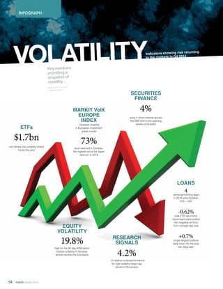 This infographic document provides a snapshot of volatility indicators across various asset classes in late 2014. Equity volatility reached a high of 19.8% in October, nearly double the level in July, signaling rising risk in financial markets in the fourth quarter. Short interest in the S&P 500 jumped 4% in early October. Loans had their worst four days of the year from October 10-14, with total year-to-date returns for liquid loans falling into negative territory due to a single-day loss, though a positive return two days later partially offset this.