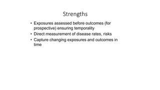This document outlines the strengths and challenges of cohort studies. The strengths include examining multiple health outcomes and exposures over time without binary classifications. Participants can change exposure levels. Exposures are measured before outcomes, allowing assessment of temporality. Challenges include loss to follow-up, expense of repeated data collection, long time to conduct, inefficiency for rare outcomes, reliance on historical data quality, ensuring blind outcome assessment, challenging exposure classification, requiring sufficient population exposure variation, and loss to follow-up potentially introducing bias if associated with outcomes or exposures.