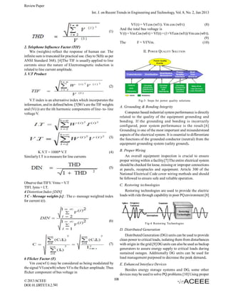 The paper discusses the significance of power quality (PQ) issues arising from the increasing use of power electronics and microprocessor-based loads, highlighting the necessity for accurate measurement and classification techniques for PQ disturbances. It provides an overview of various classification methods and technologies employed to mitigate PQ problems, including artificial intelligence approaches and restoring technologies. The economic impact of PQ is assessed, and solutions for enhancing electrical system performance through proper grounding, bonding, and distributed generation are proposed.