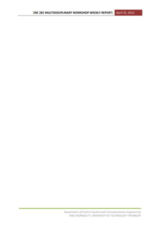 This weekly report from an engineering student group describes their progress on a multi-function air purifier project. The group aims to design a machine that purifies air and provides relaxation. They are working to combine four operating modes into a single circuit. The engineering team is extracting data from memory cards to understand device functions and applications, such as MP3 modules and power amplifiers. Their strong point is combining all operating modes, while their weakness is communication within the group. Next steps are to finish integrating all functions onto a printed circuit board.